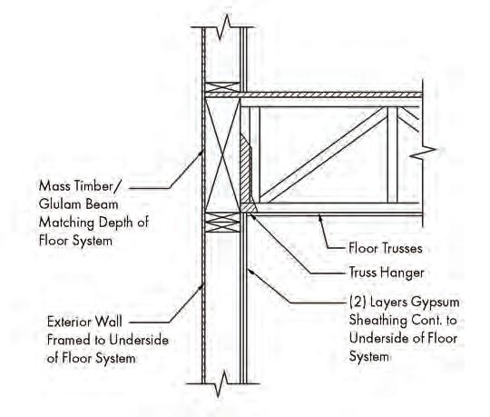 Another method to frame the intersection of the floor with an exterior wall of a wood structure is using semi-balloon framed wall construction, where the floor system utilizes top chord bearing trusses to bear on the exterior wall below. Like the platform framing method, the vertical support of the exterior wall above shall have a 2-hour FRR; however, for this method, the gypsum board from below can