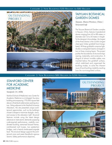 STANFORD CENTER FOR ACADEMIC MEDICINE Stanford, CA | HOK Stanford School of Medicine’s new Center for Academic Medicine is a U-shaped, four-story building encompassing 170,000 square feet above a three-level subterranean parking structure. Sitting adjacent to the Stanford University Arboretum, the site presented unique architectural opportunities, such as the building’s chosen U-shape to maximize daylight, views, and access to the arboretum itself. Structural features include using the latest design advances to meet seismic demands surpassing code-required performance, carefully coordinated buckling restrained braced frames, cantilevered roof trusses, two pedestrian bridges, and a heavily landscaped at-grade level. The structural design supports the architectural vision and meets Standford’s rigorous Seismic Safety performance objectives. 40 STRUCTURE magazine