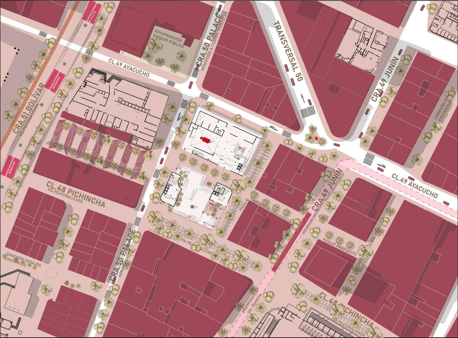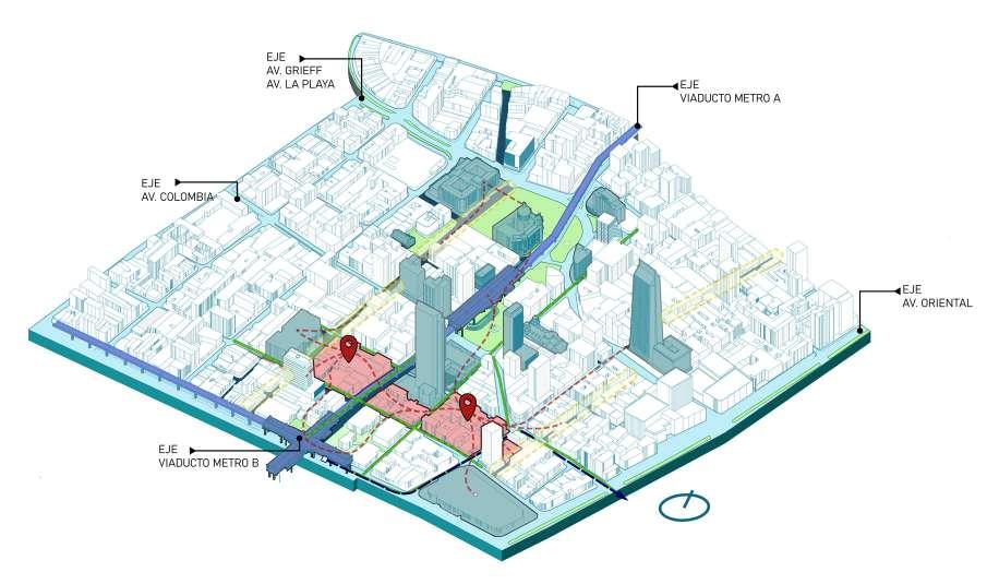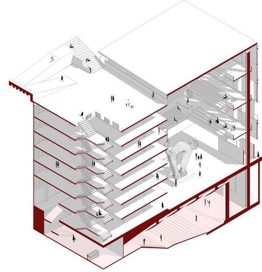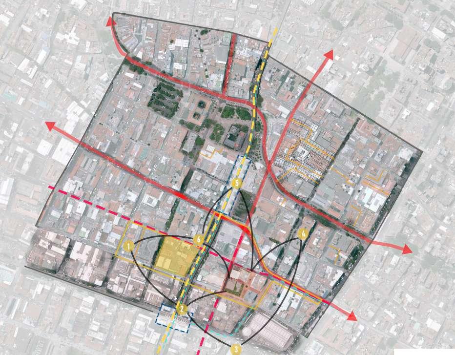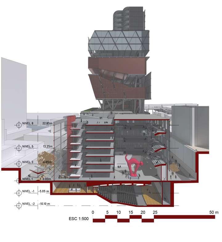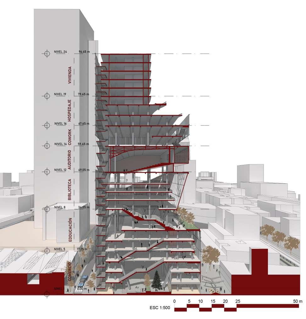 Un proyecto de ciudad vertical organizado por volúmenes horizontales, donde cada una de las plantas tiene relación con las otras por medio de vacíos. Es un conjunto hibrido de programas y forma, cuenta con aulas de clase, talleres una biblioteca, una mediateca, galería, museo, vivienda, coworking, centro cívico y auditorios de gran capacidad. El principio para la proyectación de la manzana fue primero entender lo propio del lugar con el fin de entender sus dinámicas, y así conectar los nodos de los pasajes. También comprender y respetar su contexto y paisaje urbano.