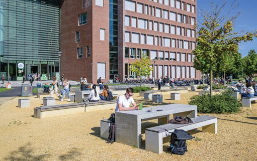 Lange levensduur Mertens adviseerde de basiselementen uit te voeren in zelfverdichtend beton (ZVB), een duurzaam, onderhoudsvrij materiaal met een gladde textuur. ‘Dat heeft een lange levensduur, ziet er strak en modern uit en is in vrijwel elke kleur te storten,’ licht hij toe. Het werd lichtgrijs: een neutrale kleur, die warmte bovendien niet absorbeert. Mertens en Van Riet gingen na met welke banken en zitelementen het ontwerp voor de WUR uitgevoerd kon worden en welke aanpassingen eventueel nodig waren. Die bleken alleen noodzakelijk voor de ronde picknickset uit het assortiment. ‘Vanwege de houten zittingen op het beton zou de afstand tot het tafelblad vrij krap worden,’ vertelt Van Riet. ‘Daarom hebben we de tafel in overleg verhoogd.’ In een jaar tijd werd de Campuslijn ontwikkeld, geassembleerd en gefaseerd geleverd. Plannen voor een uitbreiding bij de WUR zijn er vooralsnog niet. Wel heeft Van Riet net een statafel aan haar Solar-collectie toegevoegd. Ook werkt ze aan een proef met houten zittingen.