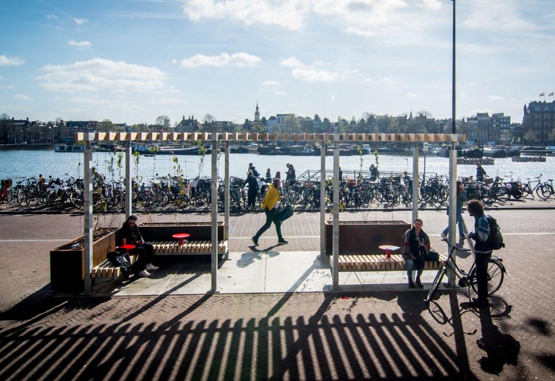 De stadspergola bij de Openbare Bibliotheek Amsterdam biedt niet alleen verkoeling, maar is ook een ontmoetingsplek.
