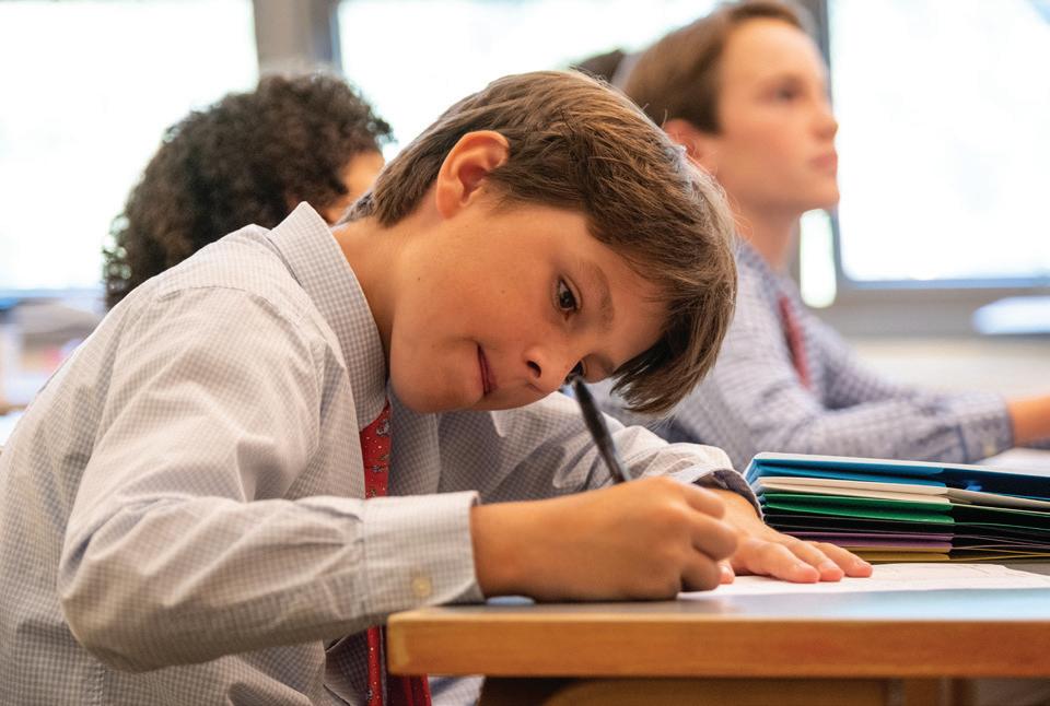 In grades seven and eight, students work with teachers to master the fundamentals of grammar. Instructors pay careful attention to building vocabulary and to gaining a firm grasp of mechanics— parts of speech, usage, spelling, and punctuation—as each student develops his writing voice. Frequent writing, both in English and across the curriculum, promotes clarity of expression and evokes from students their unique interpretations and opinions.