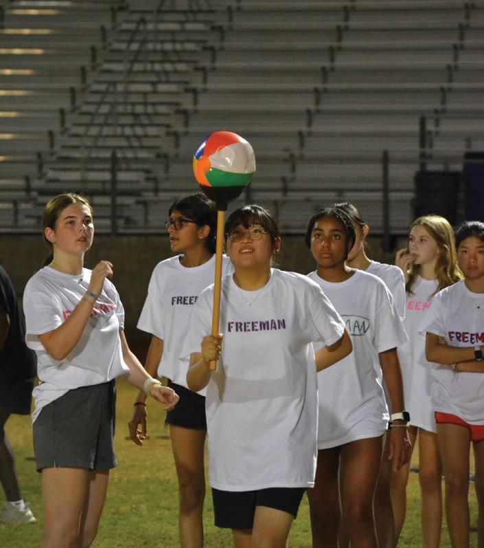 Top to Bottom: Seema Pandya ’94 stands with her art installation; Upper School students play Spikeball on the Hill; Students enjoy a school pep rally