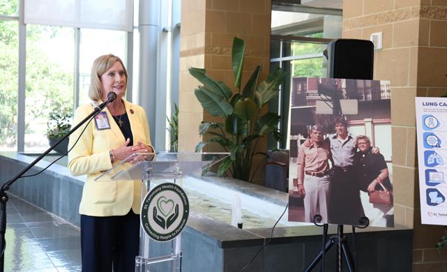 St. Tammany Health System President and CEO Joan Coffman addresses those gathered Sept. 3 for the announcement of a half-million dollar gift from the Mauti Cancer Fund to help purchase what will be region’s first mobile lung cancer screening bus. (Photo by Tory Mansfield/STHS)