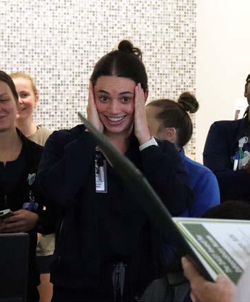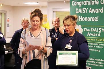 1) STHS Adult ICU nurse Amber Thompson, photographed surrounded by team members and health system leaders, shows off her Daisy Award for Extraordinary Nurses. 2) Nurse Paige Coleman’s mind is blown upon learning she won a Daisy Award. 3) Daisy-winning nurse Mandy Sanders wipes away a tear as Chief Nursing Officer Kerry Milton reads her nomination. 4) Public Safety Officers Leonel Ponce and Derrick Davis were recognized for going above and beyond in the fulfillment of their duties. 5) Chief Operating Officer Jack Khashou presents Occupational Therapist Jan Knobloch with a Sunflower Award. 6) Drs. Joseph Landers and Andrew Baier were named recipients of the St. Tammany Quality Network Medical Director’s Award for the second quarter of 2025. 7) Imaging Services Supervisor Mandi Stanga shows off her Sunflower Award, bestowed upon colleagues for their support of the nursing mission.