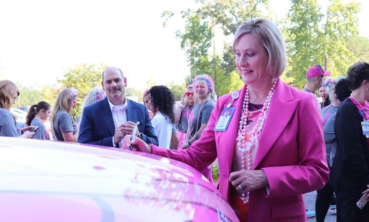 St. Tammany Health System President and CEO Joan Coffman signs a pink-wrapped Sheriff’s Office vehicle at the launch of the health system’s monthlong Power of Pink breast cancer awareness campaign. As part of the campaign, people can sign the Sheriff’s vehicle in exchange for a $5 donation. (Photos by Tory Mansfield/STHS)