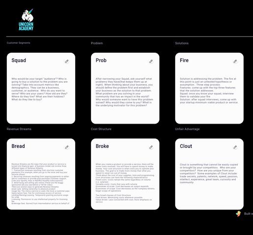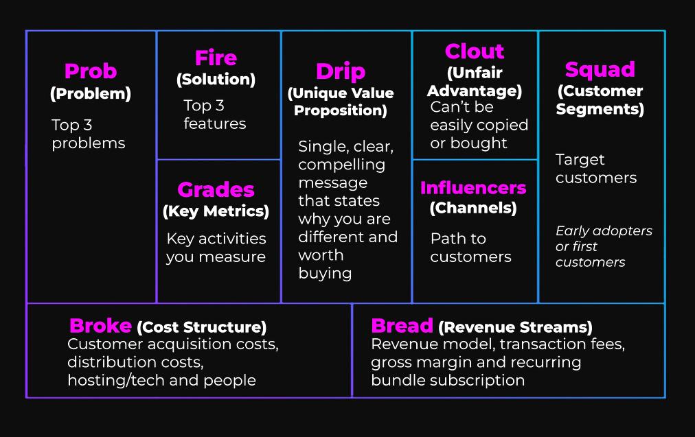 The lean business model canvas (BMC) is like the blueprint of your business, it helps entrepreneurs visualize how their business idea works – who do you serve (Squad), what you’ll sell (Fire), how you’ll earn money (Bread), how you are unique (Drip), etc... Your Business Model Canvas is meant to change and be updated as you define your idea, talk to your customers, learn, validate your assumptions, and test your prototypes.