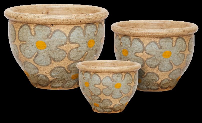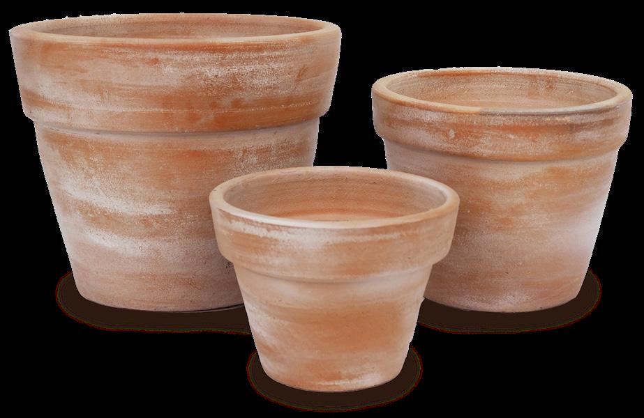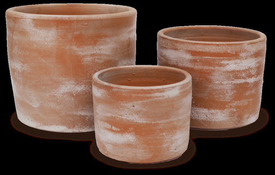 This collection is crafted by hand, using traditional tools and techniques, and is crafted from a durable terra cotta clay which is suitable for three-season outdoor use in all climates. The pots have a slight antique whitewash applied to them, but are otherwise unfinished, and will allow for air and water to flow through the body of the pots.