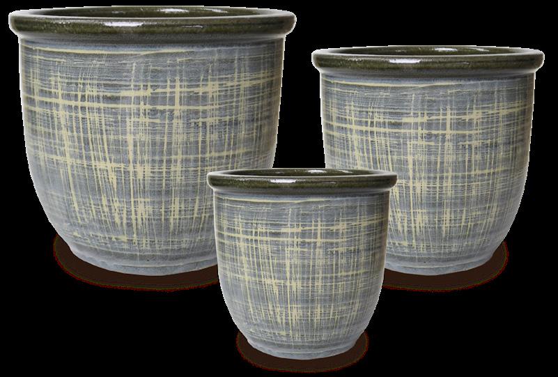 This 1/3 pallet includes 18 x 3 pot sets of our classic Ipoh Pot shape, etched with an organic spiral pattern, and assorted in the four earthy glazes shown here (from top):