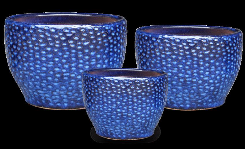 This 1/3 pallet includes 18 x 3 pot sets of our Armadillo Egg Pot shape, embossed with a geometric scale pattern, and glazed in the following three colors: