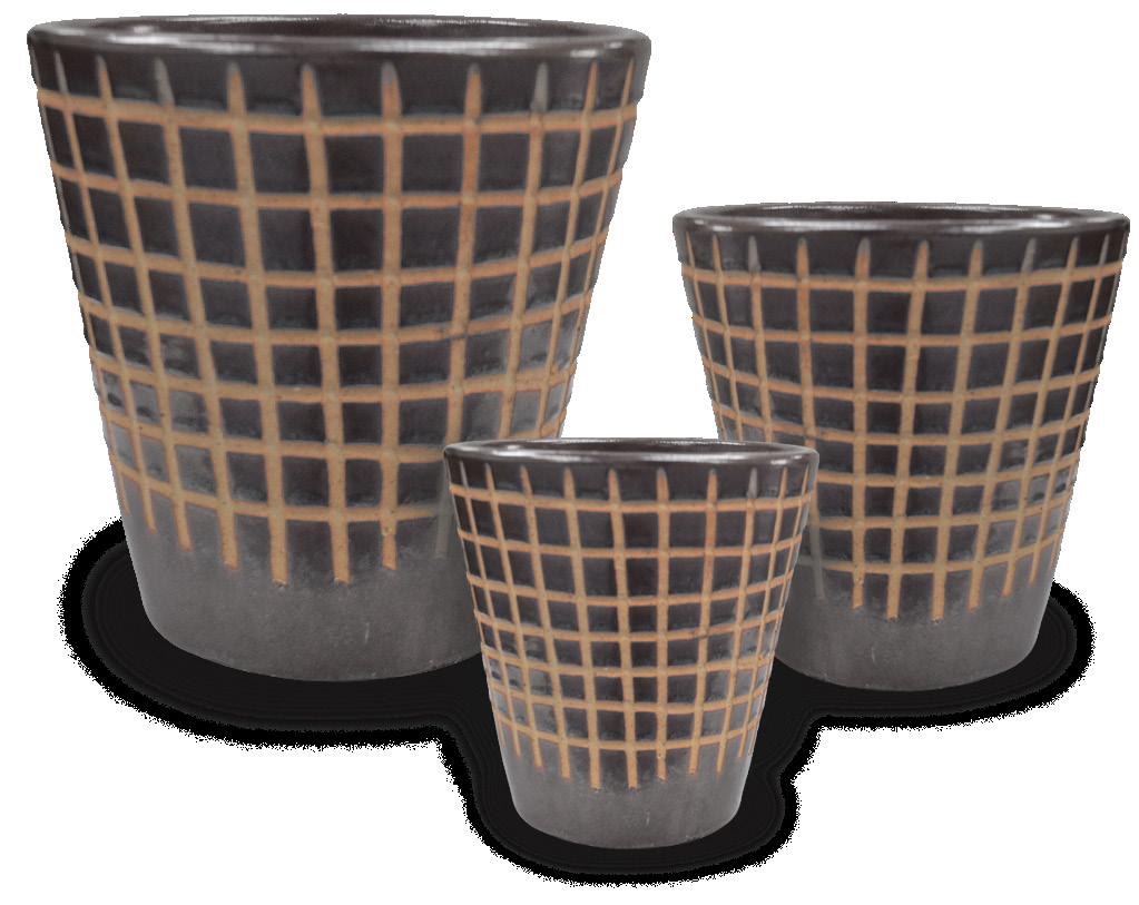 This 1/3 pallet includes 18 x 3 pot sets of our Conical Pot shape, etched with an grid pattern reminiscent of urban windowscapes, and assorted in the four contemporary glazes shown here (from top):