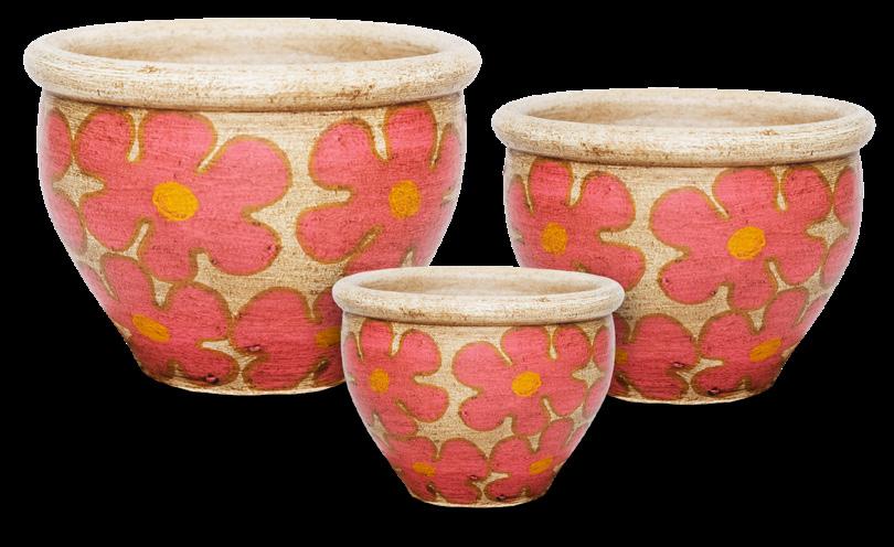This 1/2 pallet assortment includes 4 x 3pc sets of each the 3 decorations shown here - keep in mind that the pots and decorations may vary from the photos below, as they are all individually hand-crafted.