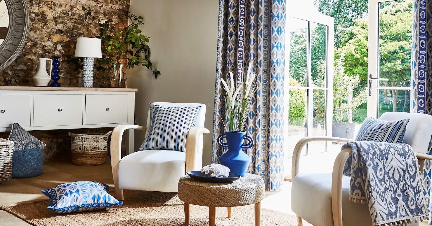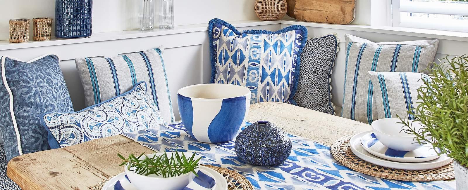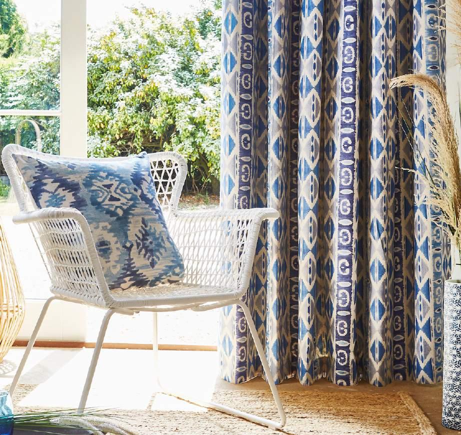 Inspired by the natural beauty of Grecian islands, the Santorini Collection presents a quintessentially Mediterranean range of prints, damasks, and tactile jacquards. The collection’s painterly watercolour designs are presented on a linen-look fabric for a laid-back, rustic finish, with complementary weaves working alongside tile designs for a cohesively Grecian look. A palette of washed cobalt's, muted corals and soft teals capture white-washed Aegean shores, presented with sandy tones and shale grey hues for a contemporary take on the Mediterranean theme.
