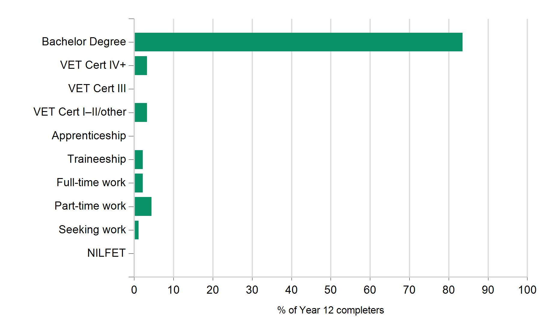 This section examines the education and training destinations and includes Bachelor Degree, VET Certificate IV+, VET Certificate III, VET Certificate I-II/other, Apprenticeship and Traineeship main destinations.