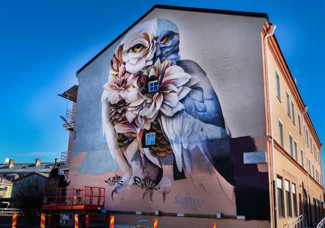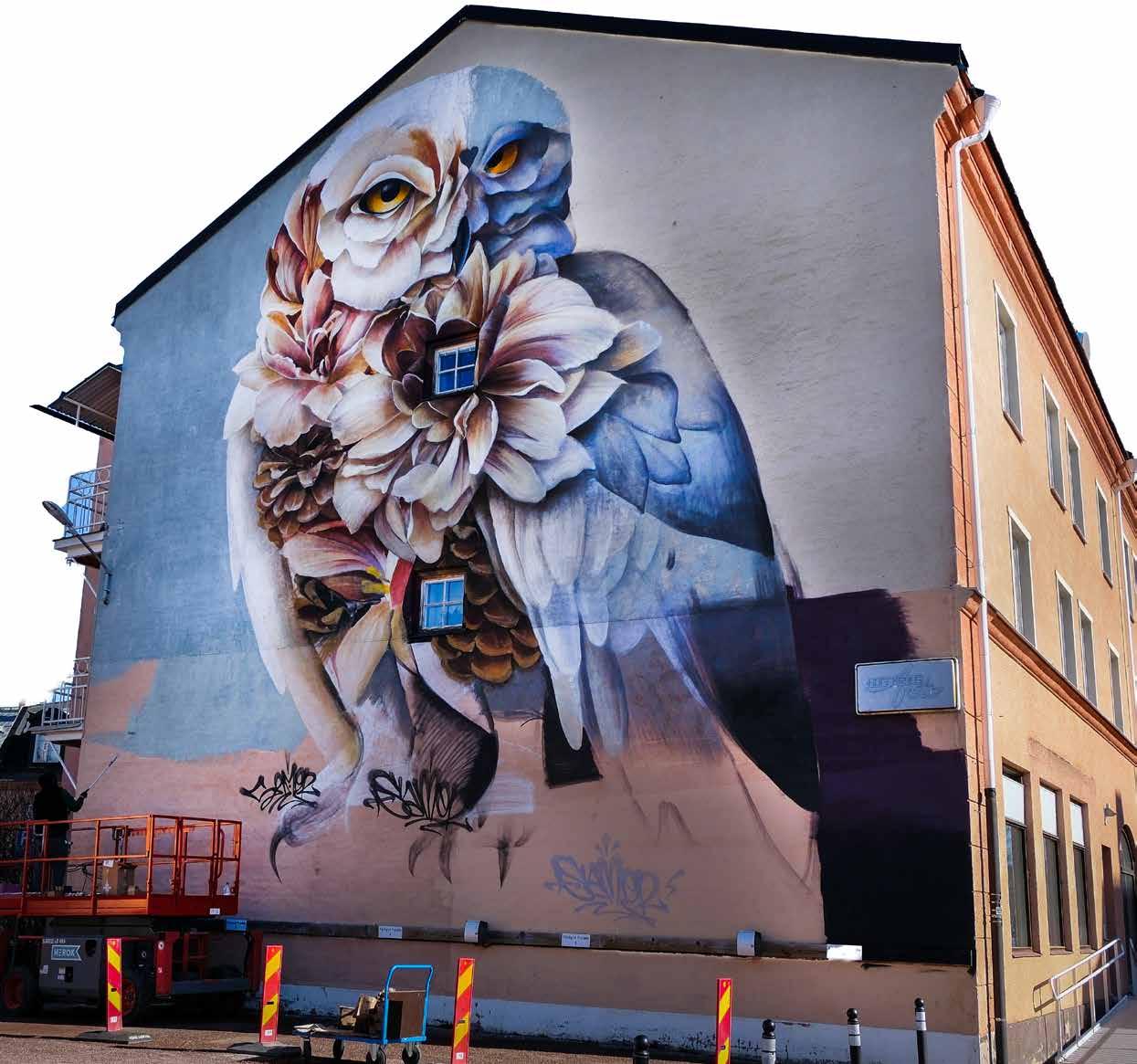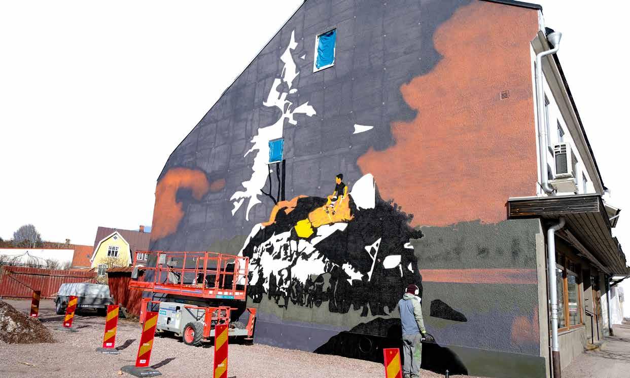 En av konstnärerna med sin pågående muralmålning.