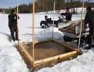 Vi sågade upp hål med motorsåg för att sänka ned snickrade ”träkistor" i sjön. Kistorna är två gånger två meter och 50 centimeter höga. Det är viktigt att det är en jämn botten för att kunna sätta ned dem, de får inte välta. Materialet som vi fyllde i kistorna var runda stenar, ungefär i storlek som en snöboll. Stenmaterialet är viktigt ef tersom det ska ge en bra genomströmning och bra lekmöjligheter för rödingen. Meto den är inte ny utan beprövad sedan tidigare. Det har visat bra resultat från projekt i till exempel Rotälven. Där har man sänkt ned mindre stenkistor. Inte så stora alltså som de vi har sänkt ned i Rämmasjön. De mindre är cirka fyrtio gånger fyrtio centimeter, men samma teknik innehållande runda stenar.
