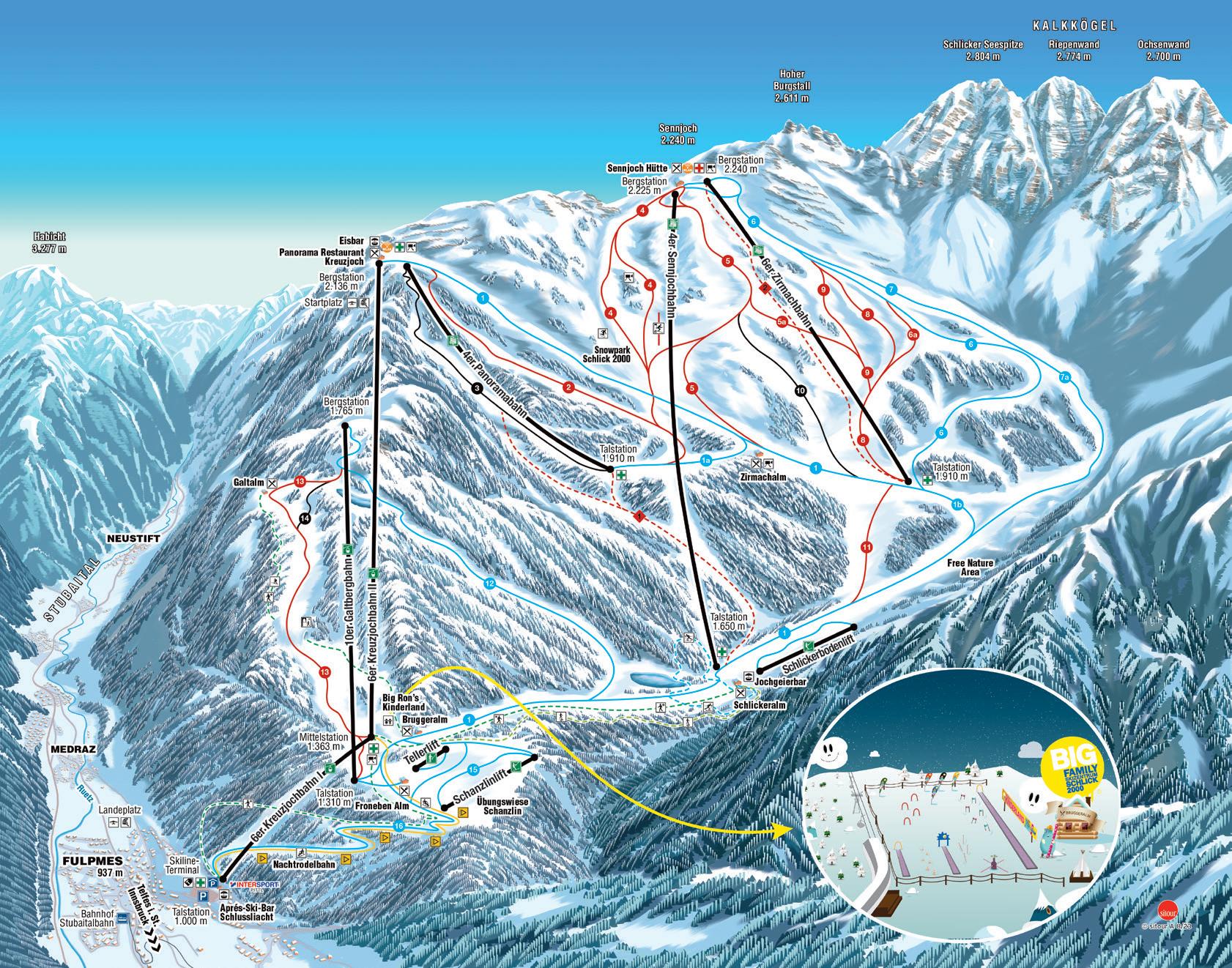 Schlick 2000: an jeder Station, an jeder Hütte, Alpinnotruf 140, Talstation Tel. 0043 5225 62321