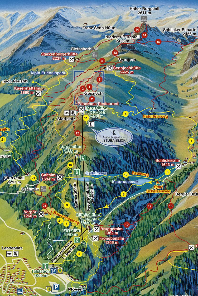 z horní stanice lanovky Schlick 2000, Kreuzjoch dosažitelná za 1,5-2 hod. Z Fulpmesu nebo Neustiftu za 3.5 h nebo z Froneben přes Kaserstattalm 2.5 h. Nádherný rozhled na stubaiský svět hor! Centrální vyhlídka 7 Summits