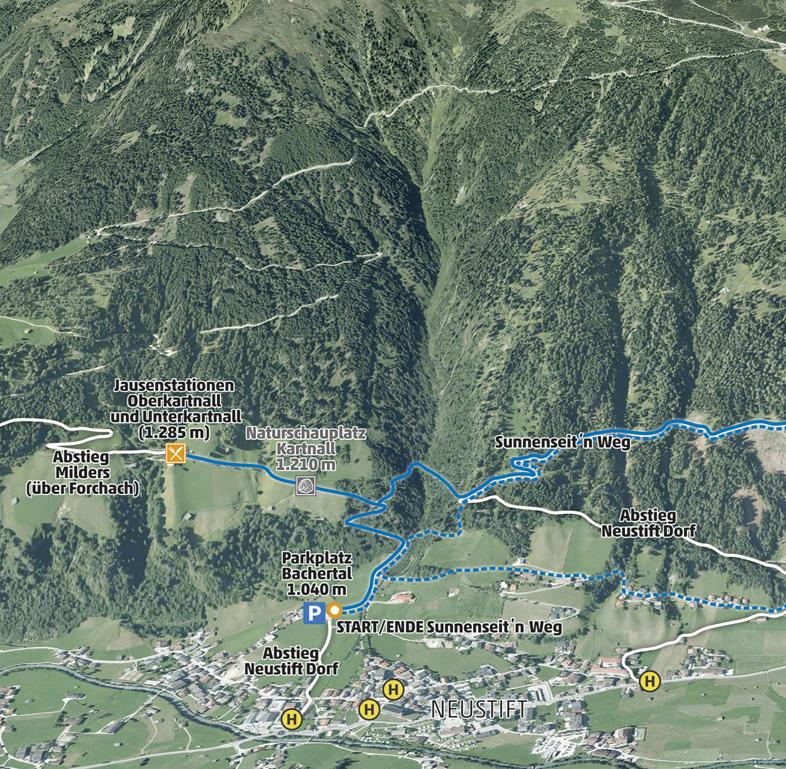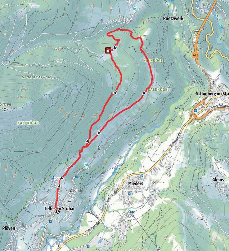 lesem k hostinci Stockerhof. Zpět se vracíme po stejné cestě nebo sestupujeme od Stockerhofu, dokud nepřekročíme koleje lanovky Stubaitalbahn a nepůjdeme po dolní cestě přes Telferské louky zpět do výchozího bodu.