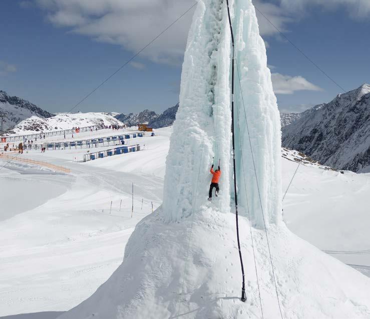 20 m hoher Eiskletterturm bei der Bergstation Gamsgarten, ideal für Einsteiger-Kletterkurse und gute Trainingsmöglichkeit für alle Geübten. Dezember bis März geöffnet. Anfängerkurse können direkt beim Stubai-Alpin-Bergführerbüro (Kontakt auf Seite 7) gebucht werden.