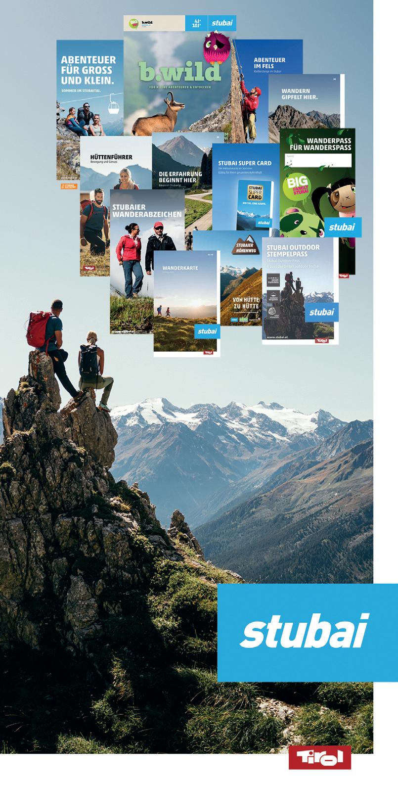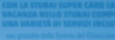 NOTE LEGALI: Edizioni, ufficio inserzioni, composizione: Bergverlag & Graficdesign Eberharter, 6373 Jochberg, Kitzbüheler Str. 32, Tel. 0043/(0)5355/5492, Fax /5492-20; Testi: sentieri tematici, elenco dei rifugi Ufficio per il Turismo Stubai Tirol KöR, Dorf 3, Stubaitalhaus, 6167 Neustift i. Stubaital. Immagini: Ufficio per il Turismo Stubai Tirol (anche titolo) • Editore TKV Chizzali, Rum/Innsbruck • Foto Holy & Sohn, Innsbruck. Si esclude qualsivoglia responsabilità per danni derivanti dall’inserimento erroneo o mancato di informazioni. © Graficdesign & Bergverlag Eberharter & Ufficio per il Turismo Stubai, A-6373 Jochberg. Pubblicazione della prossima edizione 05/2019. Senza l’esplicito consenso della casa editrice sono vietate la riproduzione, la trasmissione e la copia della presente opera o di parti di essa. Cartine: © Alpstein Tourismus GmbH & Co. KG; © Ufficio federale cartografico tedesco (BKG) e amministrazioni regionali atte ai rilievi (www.bkg.bund.de), autorizzazione alla pubblicazione Ufficio per il Turismo Stubai - estratto relativo a foto/diritto d’autore dalle Condizioni Generali di Contratto dell’industria grafica “Druck-Medien.” La casa editrice Bergverlag Eberharter detiene il diritto esclusivo di utilizzare le immagini, i testi, i supporti dati e le stampe fornite dal committente (inserzionista) per creare copie destinate alla riproduzione. L’editore Bergverlag Eberharter non è tenuto a verificare che l’inserzionista abbia il diritto di riprodurre i materiali forniti e di utilizzarli nel modo previsto; esso ha anzi facoltà di ritenere che al committente spettino tutti i diritti nei confronti di terzi necessari allo svolgimento dell’incarico. Il committente (inserzionista) assicura espressamente di essere in possesso di suddetti diritti. Il committente si impegna a tenere indenne il commissionario da qualsivoglia rivendicazione di danni o azioni legali sollevata da terzi a causa di violazioni dei diritti d’autore, dei diritti di tutela delle esecuzioni, di ulteriori diritti di proprietà industriali o dei diritti di tutela della personalità. Per informazioni su crediti fotografici e diritto d’autore si prega di consultare il sito www.bergverlag.at.