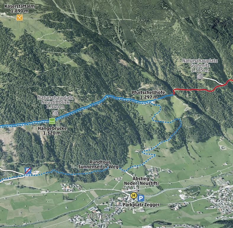 Da lì, si segue il comodo sentiero con pendenza lieve che conduce in 1 1/2 h attraverso il bosco verso la locanda Stockerhof. Al ritorno si può percorrere la stessa strada oppure scendere partendo dallo Stockerhof, fino ad attraversare le rotaie della ferrovia dello Stubaital e continuare sulla via sottostante attraverso la riserva naturale Telfen Wiesen verso il punto di partenza. Il giro completo dura ca. 3 ore.