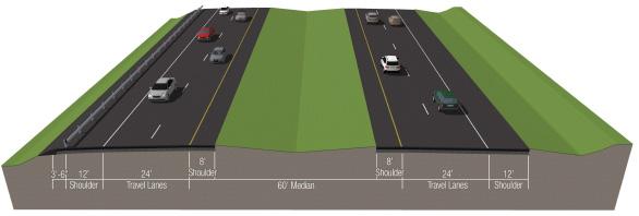 Jersey barrier—a angled concrete barrier designed to guide an errant vehicle back to the roadway and guard against hazards. Limited access—a concept whereby the entrances and exits of a roadway are restricted to certain locations—generally to allow for higher speed traffic movement due to the absence of cross streets and intersections.