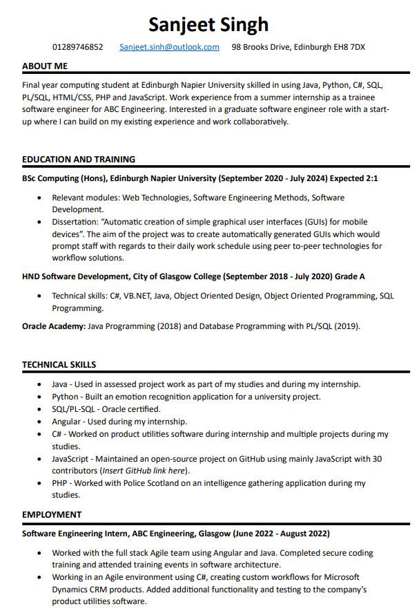 These are the main sections in a typical CV. The order of sections will vary depending on your experience.