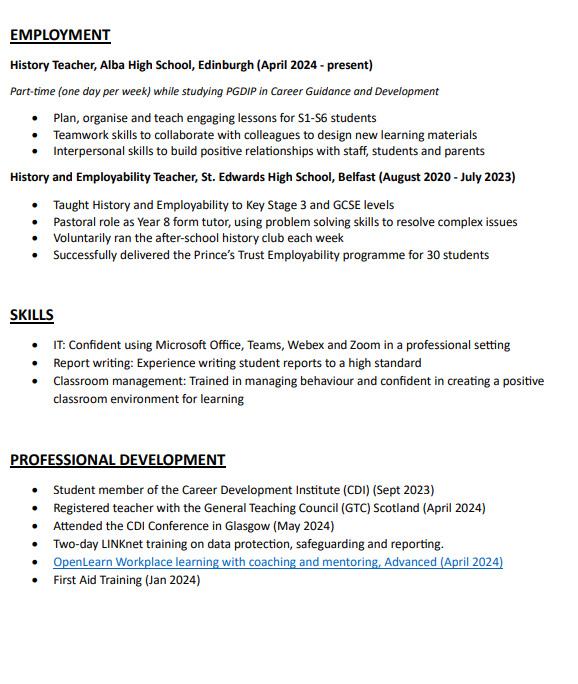 Relevant Experience: Directly linked to the job you are applying for e.g. internship in a solicitors.