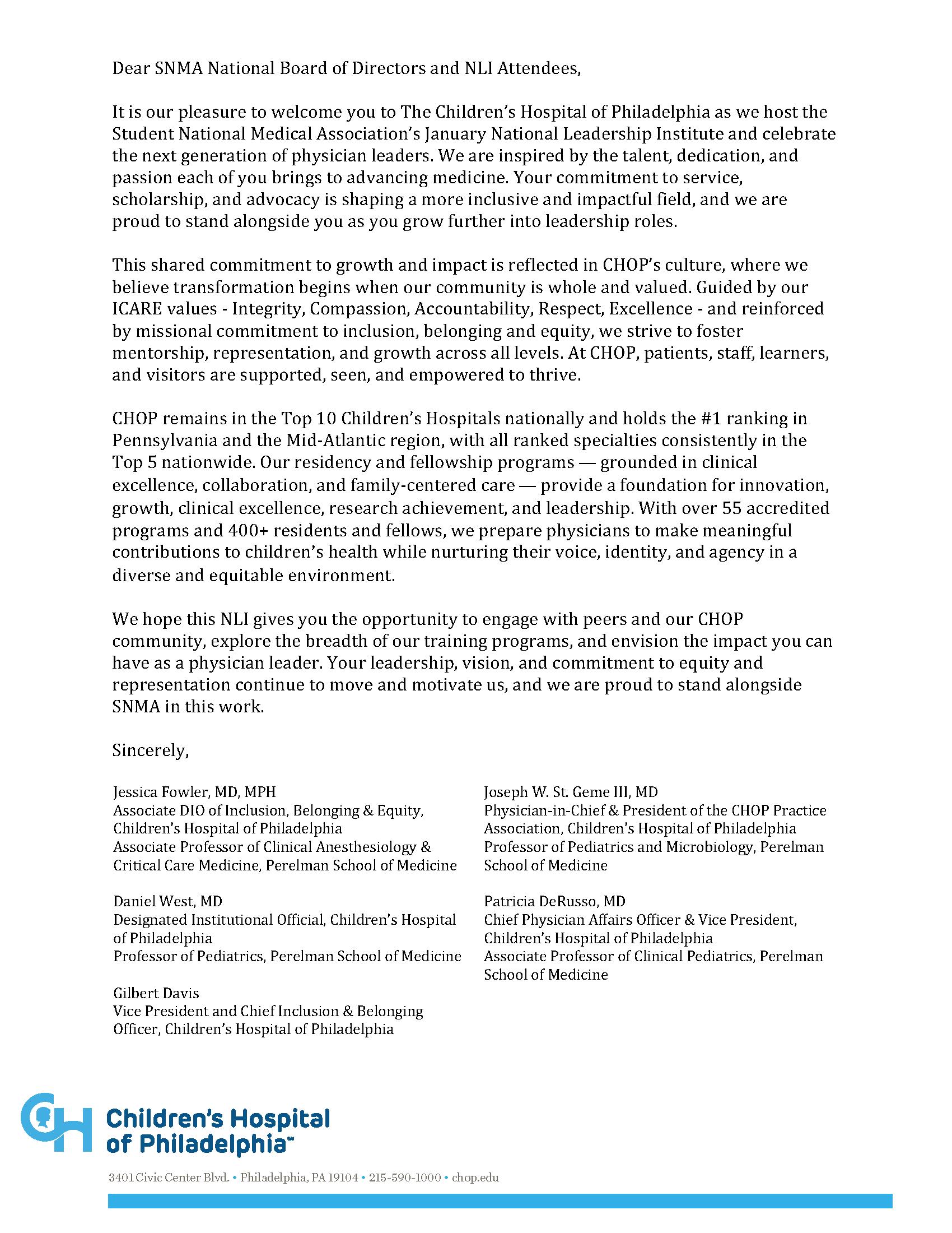 I want to extend deep gratitude to The Children’s Hospital of Philadelphia for hosting us this year and Dr. Jessica Fowler, Professional Board Member Emeritus, for her incredible commitment, planning, and hospitality throughout this process. I also want to acknowledge Region VIII for welcoming us into your region, and the SNMA chapters at the University of Pennsylvania and Drexel University for their warm hospitality and for making us feel at home in this city. Your support, energy, and partnership have been invaluable, and we are grateful.
