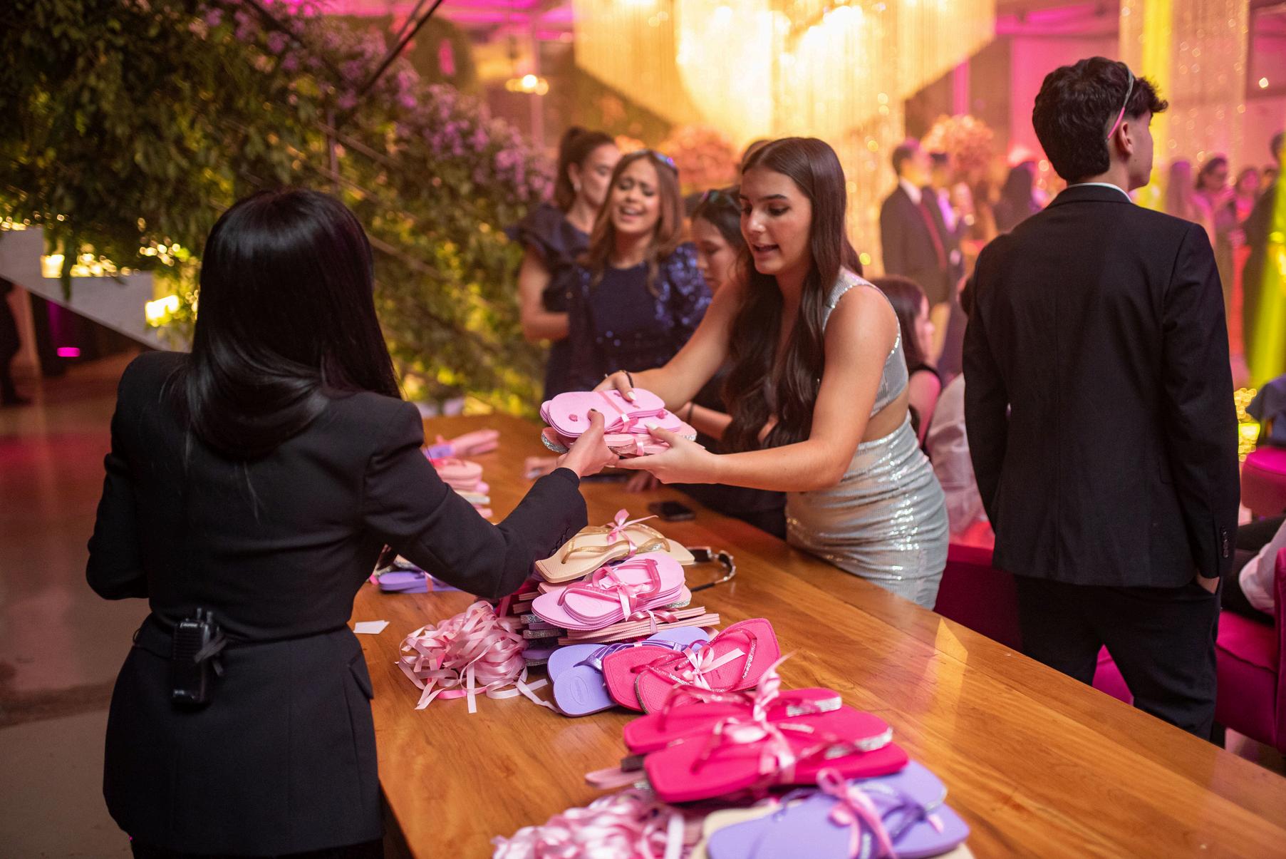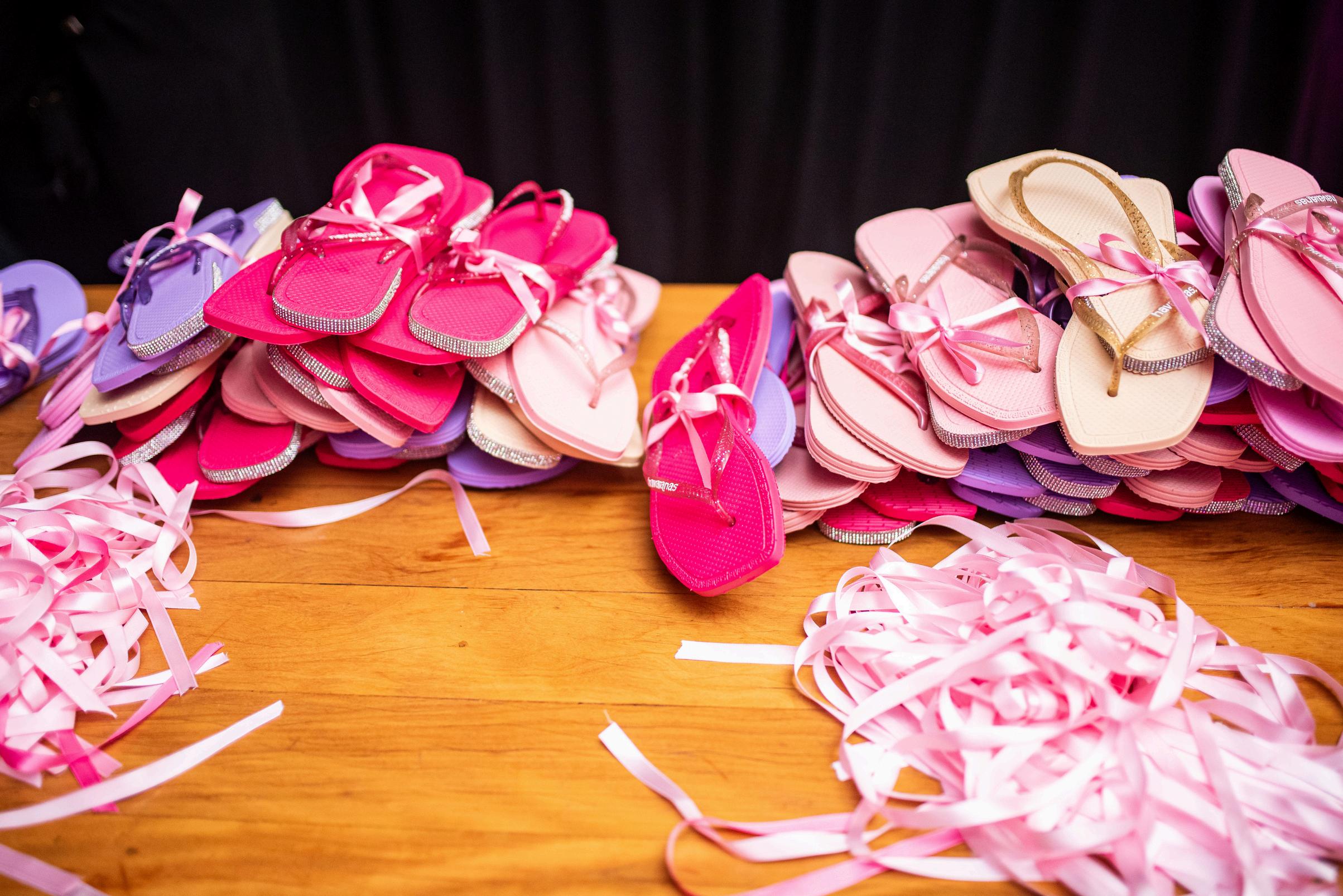 PARA DAR MAIS CONFORTO PARA AS CONVIDADAS, CHINELOS PERSONALIZADOS FORAM DISTRIBUÍDOS PARA QUE NÃO FALTASSE ANIMAÇÃO NA PISTA DE DANÇA