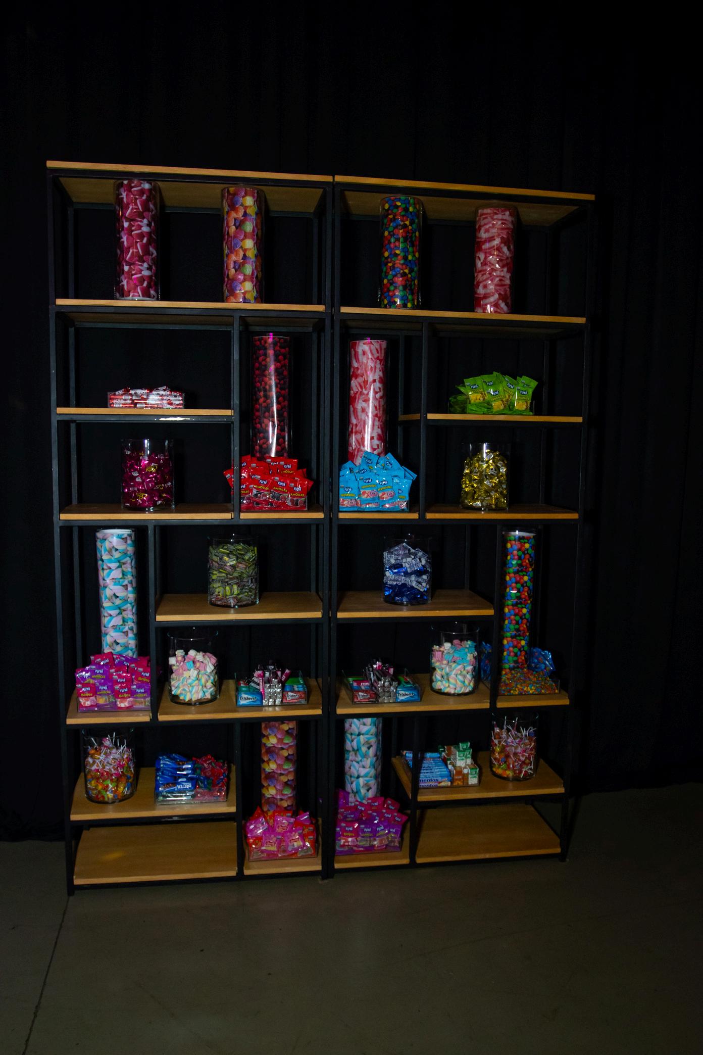 NÃO UMA MESA DE GULOSEIMAS, MAS UMA ESTANTE FOI MONTADA PARA DAR UM AR MODERNO E CRIATIVO NA DECORAÇÃO.