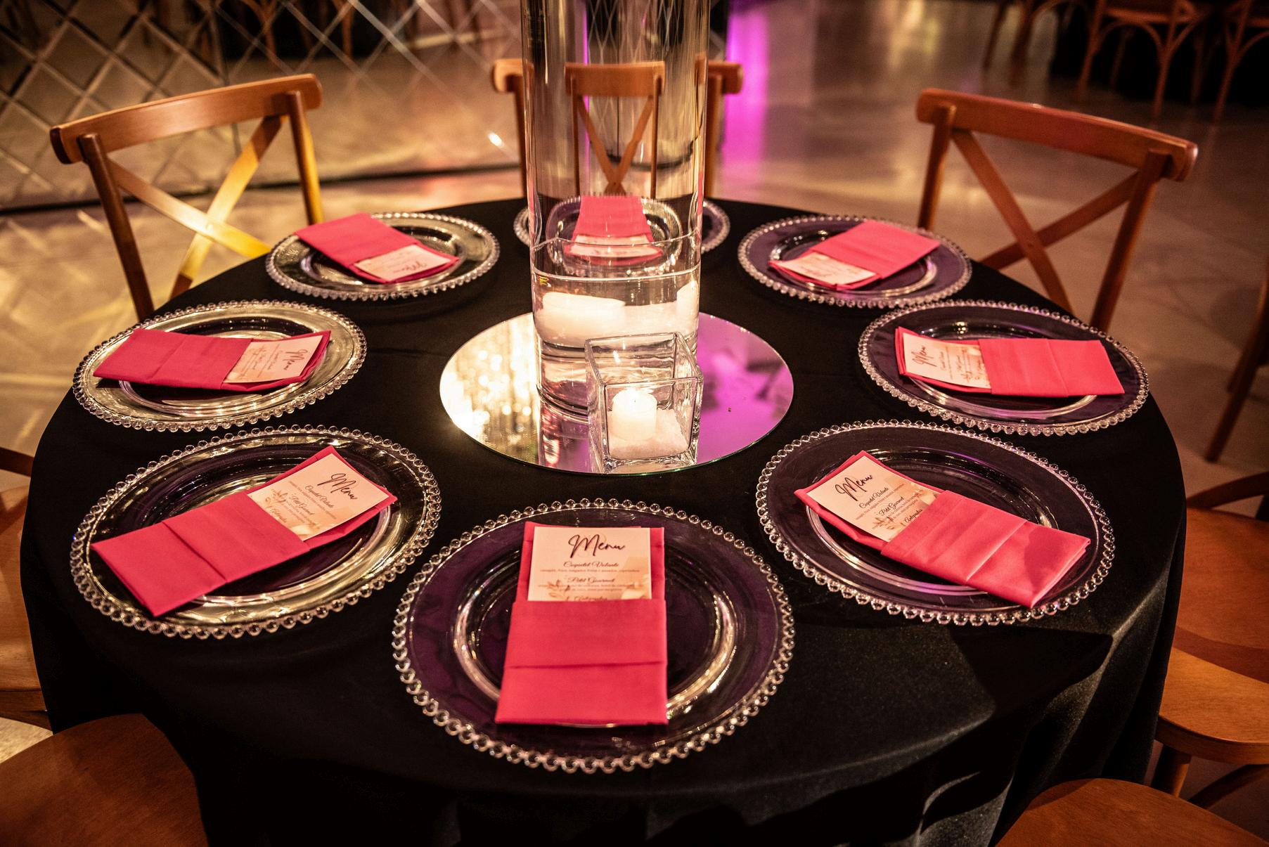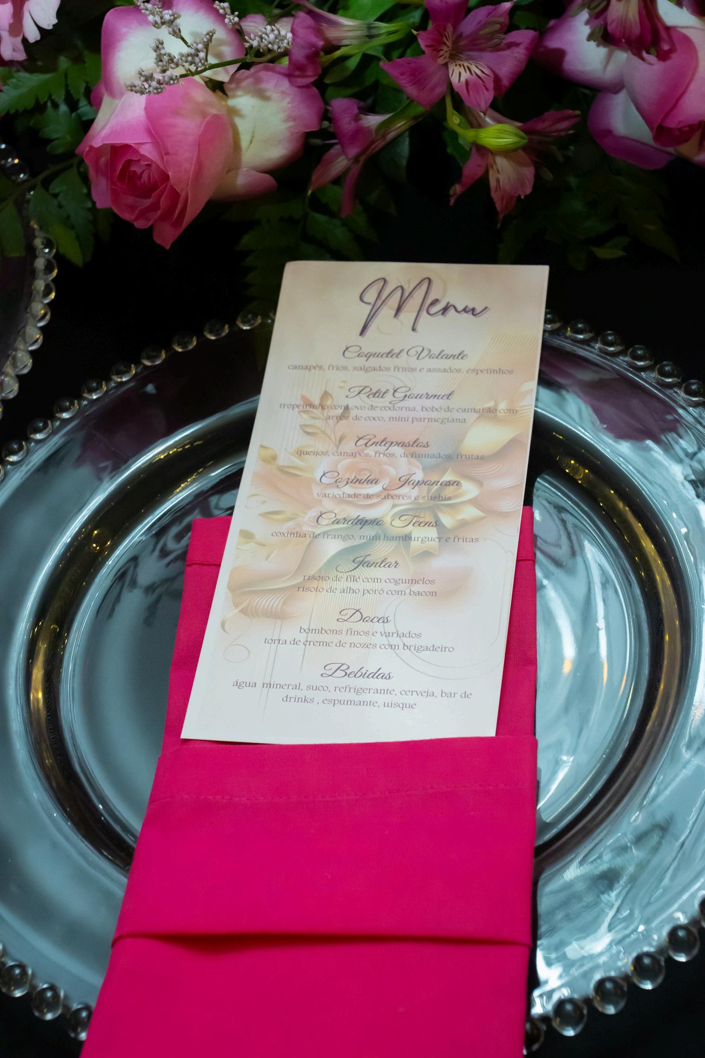 DETALHES COMO ARRANJOS DE FLORES, SUPLAST, CARDÁPIO E GUARDANAPOS