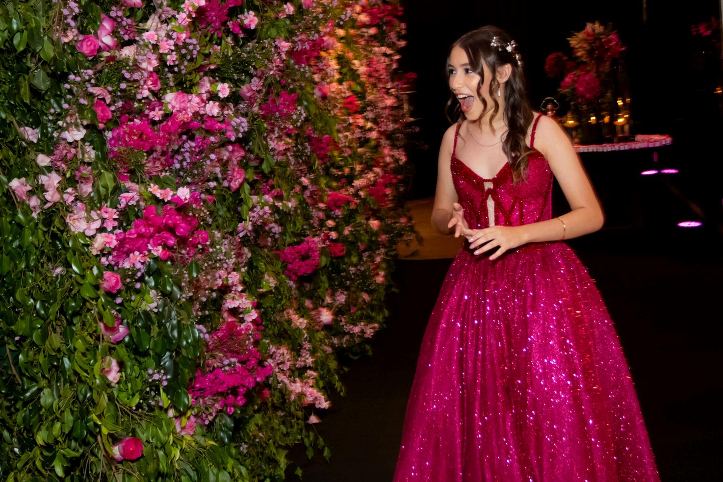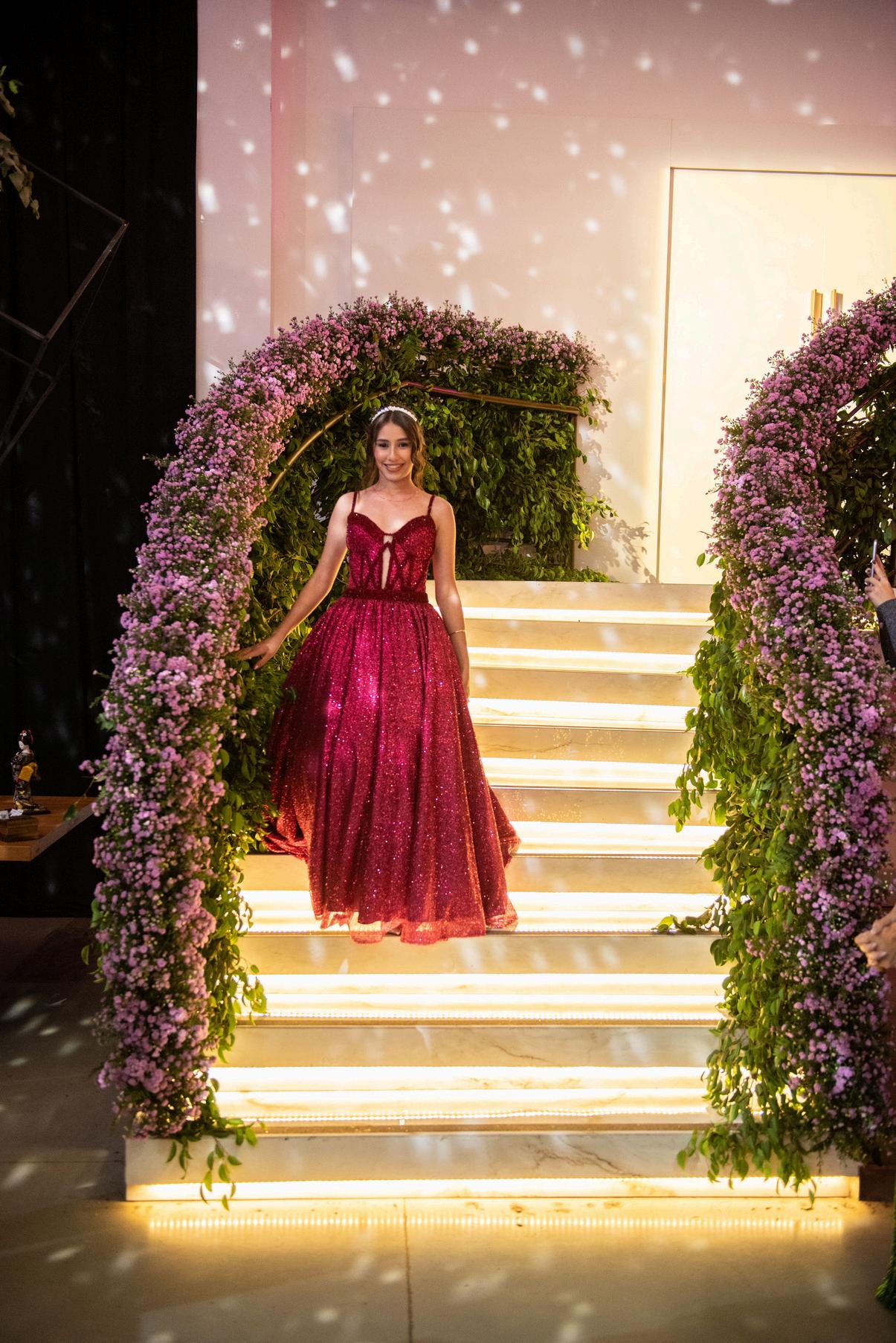 PARA MARIA FERNANDA FAZER SUA ENTRADA NO SALÃO, UMA BELÍSSIMA ESCADA FOI DECORADA COM FLORES, E FOI O PONTO ALTO DA FESTA NO MOMENTO DA VALSA E DA ABERTURA DE PISTA.