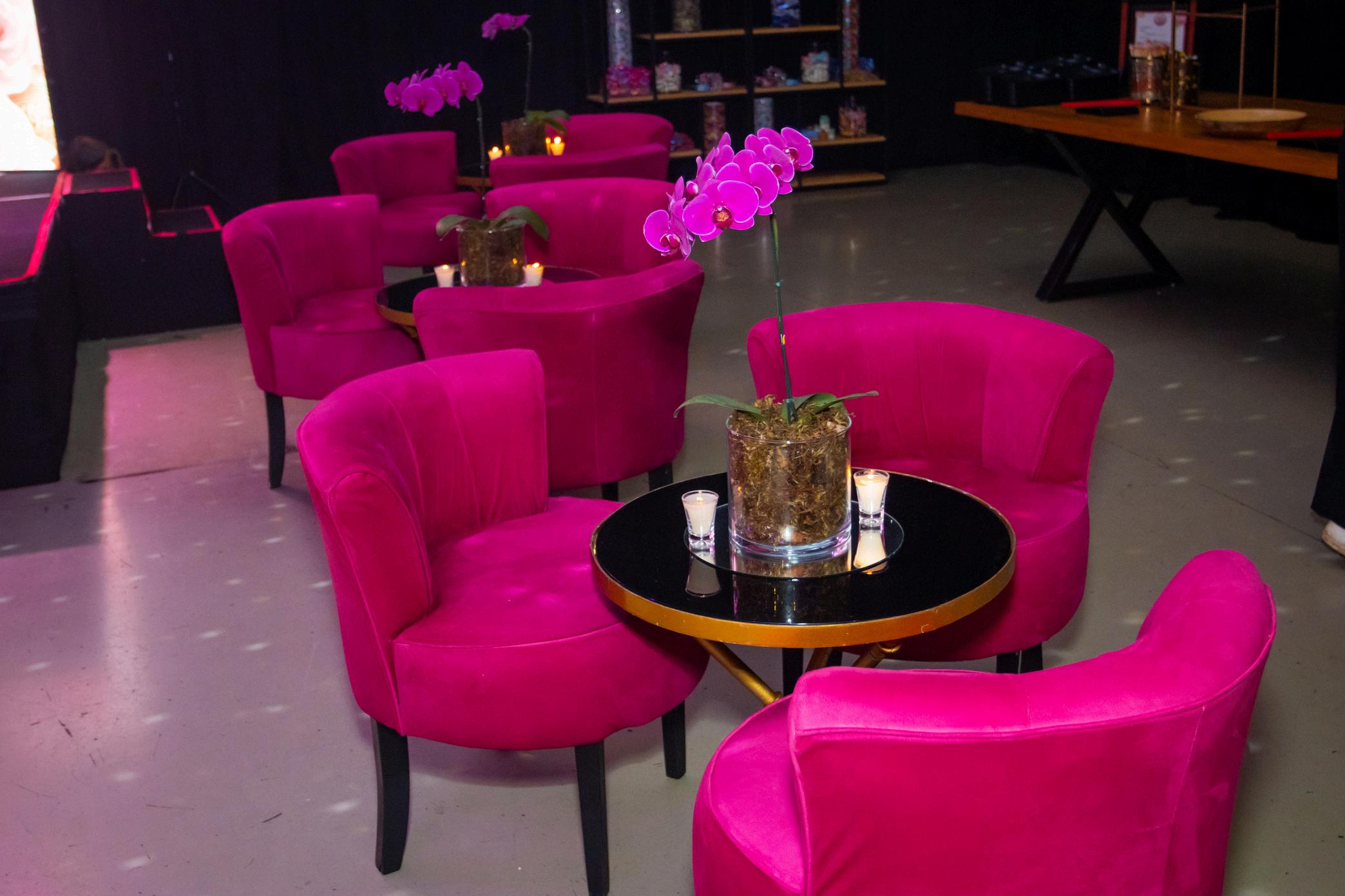 PARA O CONFORTO DOS CONVIDADOS, MESAS E LOUNGES FORAM MUITO BEM DECORADOS E DISTRIBUÍDOS PELO SALÃO DE FESTAS.