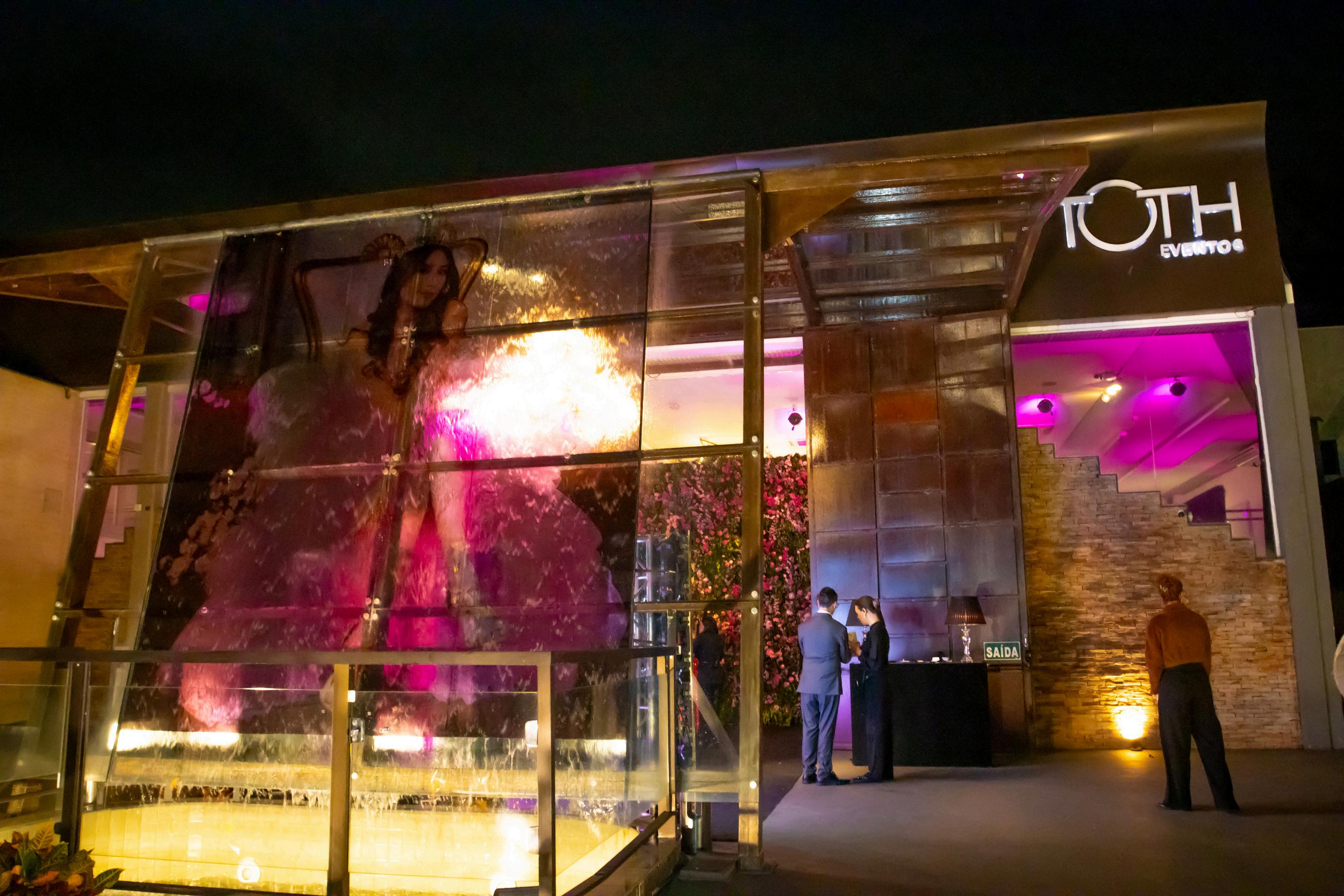 AS CORES PREDOMINANTES DA DECORAÇÃO, FORAM PRETO E VERMELHO QUE DERAM UM AR DE LUXO E SOFISTICAÇÃO AO EVENTO NA ENTRADA DO SALÃO, UMA GRANDE FOTO DO BOOK, FOI USADA SOBRE UMA BELÍSSIMA CASCATA DE ÁGUA COMO UMA FORMA DE RECEPCIONAR OS CONVIDADOS.