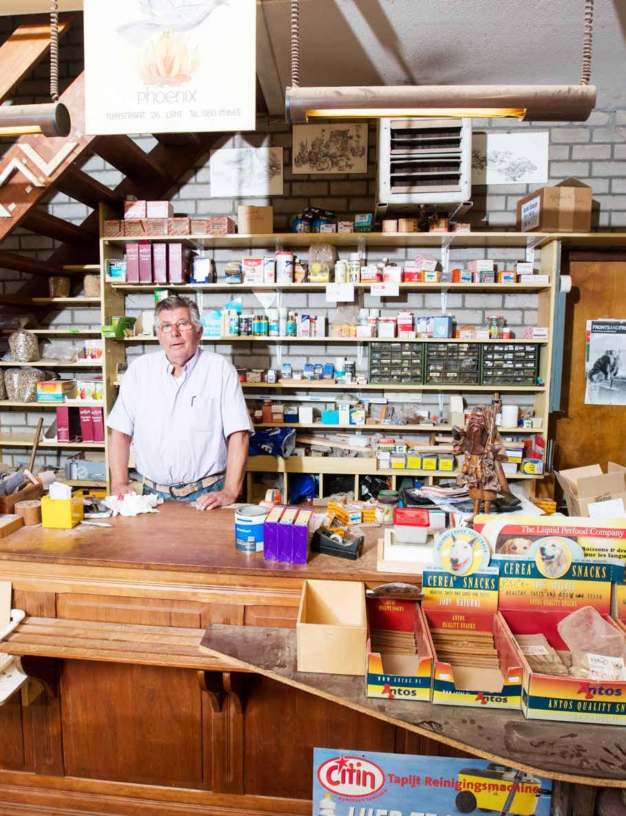 Achter de winkel is de werkplaats die Henk samen met Gerrit na een brand uitgebouwd heeft tot wat hij nu is. Ze doopten de zaak Phoenix, naar de uit de as verrezen mythische vogel, die nog altijd buiten en binnen aan de muur hangt.