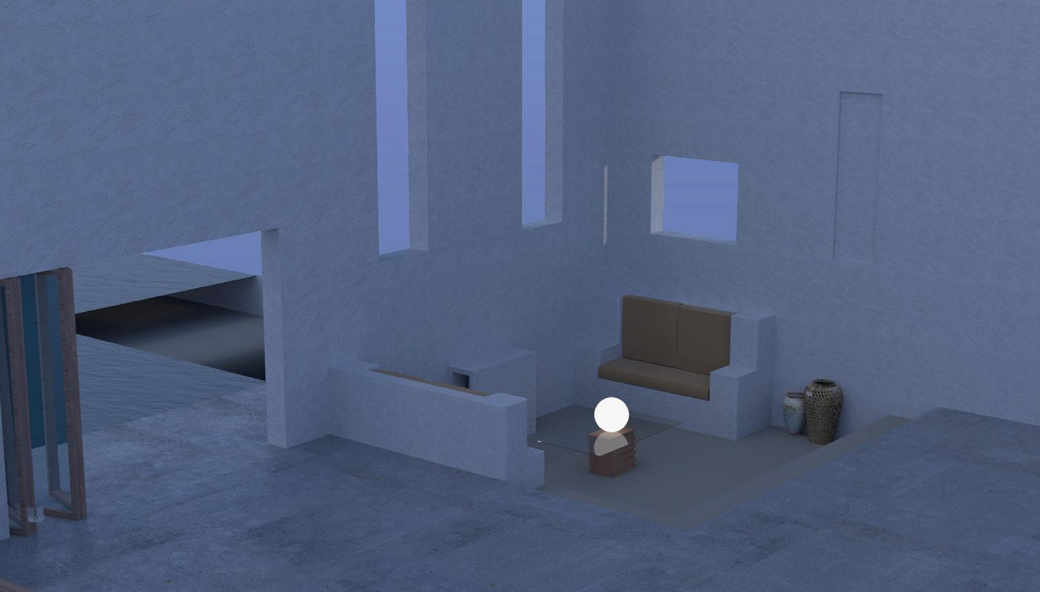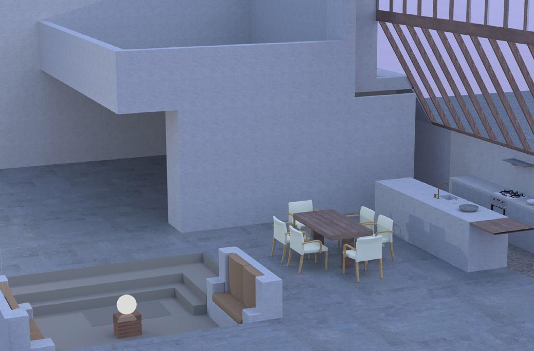 The concept design I have illustrated for a home features a living, kitchen and dining area with a double-height ceiling, and mezzanine level. I have utilised and drawn attention to the double height ceiling by creating tall windows that span across the walls. The height is further emphasised with a sunken lounge area. Although the two tall windows are directly in front of this space, they actually start well above the couches, creating a connection between the sunken lounge and surrounding space. The kitchen windows reach towards the ceiling, providing light for the mezzanine level, once again creating connection between the spaces. The windows in the kitchen also overlap to the next room, providing a beautiful framed lightwell for the adjacent room. I paid particular attention to texture, materiality, shapes and light for this design.