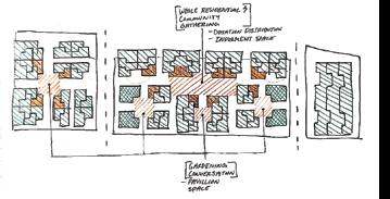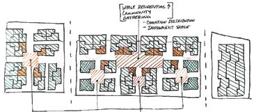 The orientation of the housing groups not only promotes maximum lighting for vegetation and creates safety among each. This residential organization encourages community behavior. (looking out for each other)