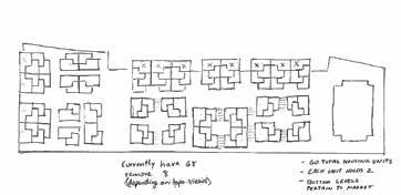 Our initiative idea is to bring the existing community more life and economic growth to the site by designing a local farmers market. From viewing the existing community, we noticed that the upbringing of urban expansion relocates the homeless through a social force. With the concern of bringing more movement to the area and how it can impact the homeless, we would like to include them in this new development. A portion of the site will be signi cant to aiding those with no residency or unemployment. They will be housed on the secondary level of the farmers market to give the inhabitants a private space. Housing will be organized into comfortable living spaces, a small living room, a kitchen, and a bathroom. The application would be through a questionnaire and proof of the individual’s situation. To achieve the mental and physical growth of habitants we provide services such as nancial advisory, nutrition, physical therapy, and counseling. After making a certain amount of income from the market and services we help the individuals transition to better opportunities.