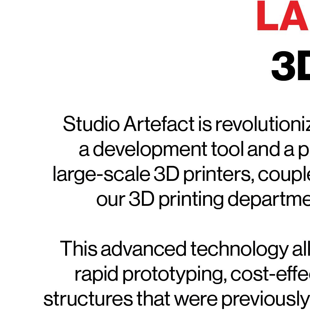 Adopting 3D printing not only as a way to innovate and prototype but as a mean of production is one of the many ways, we, at Studio Artefact, change the way things are traditionally done. Our largescale 3D printers can print up to 20 cubic meter and the expertise we developed is what makes this department one-of-a-kind.