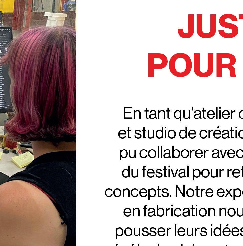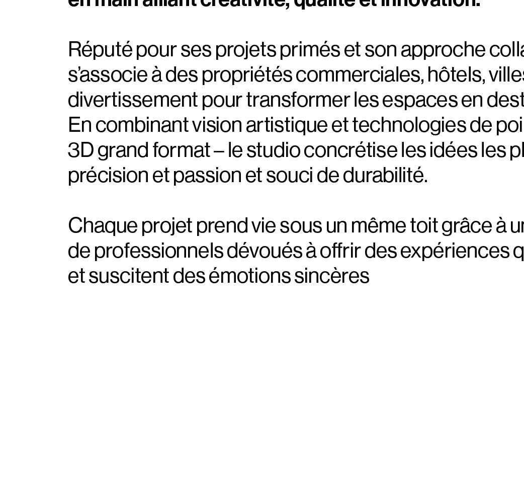 Imaginez 14 départements spécialisés bourdonnant d’énergie, chacun formant un univers à part entière. Ici, notre équipe diversifiée d’artisans transforme des idées audacieuses en réalités époustouflantes, de la conception à la création, le tout sous un même toit.