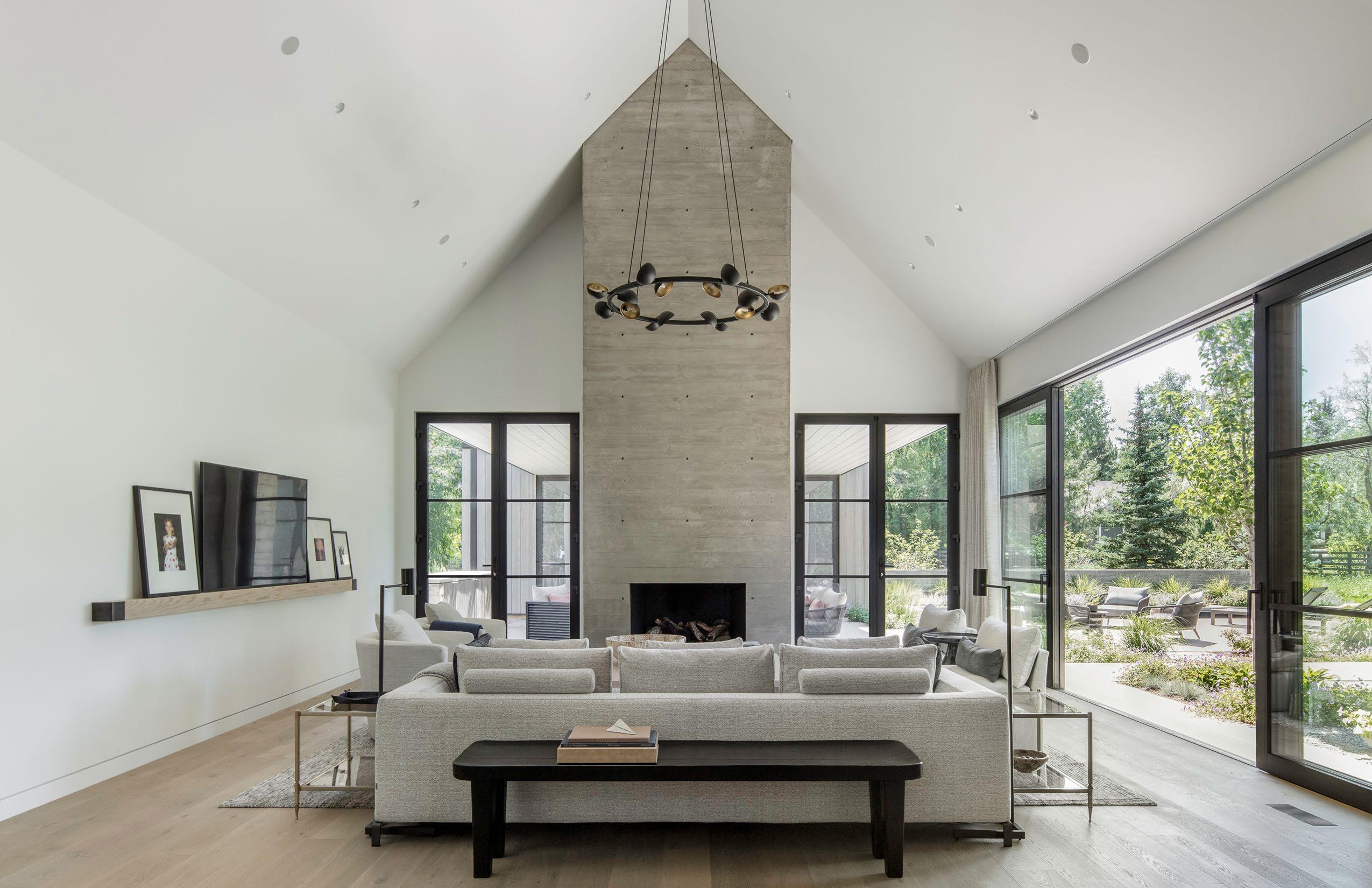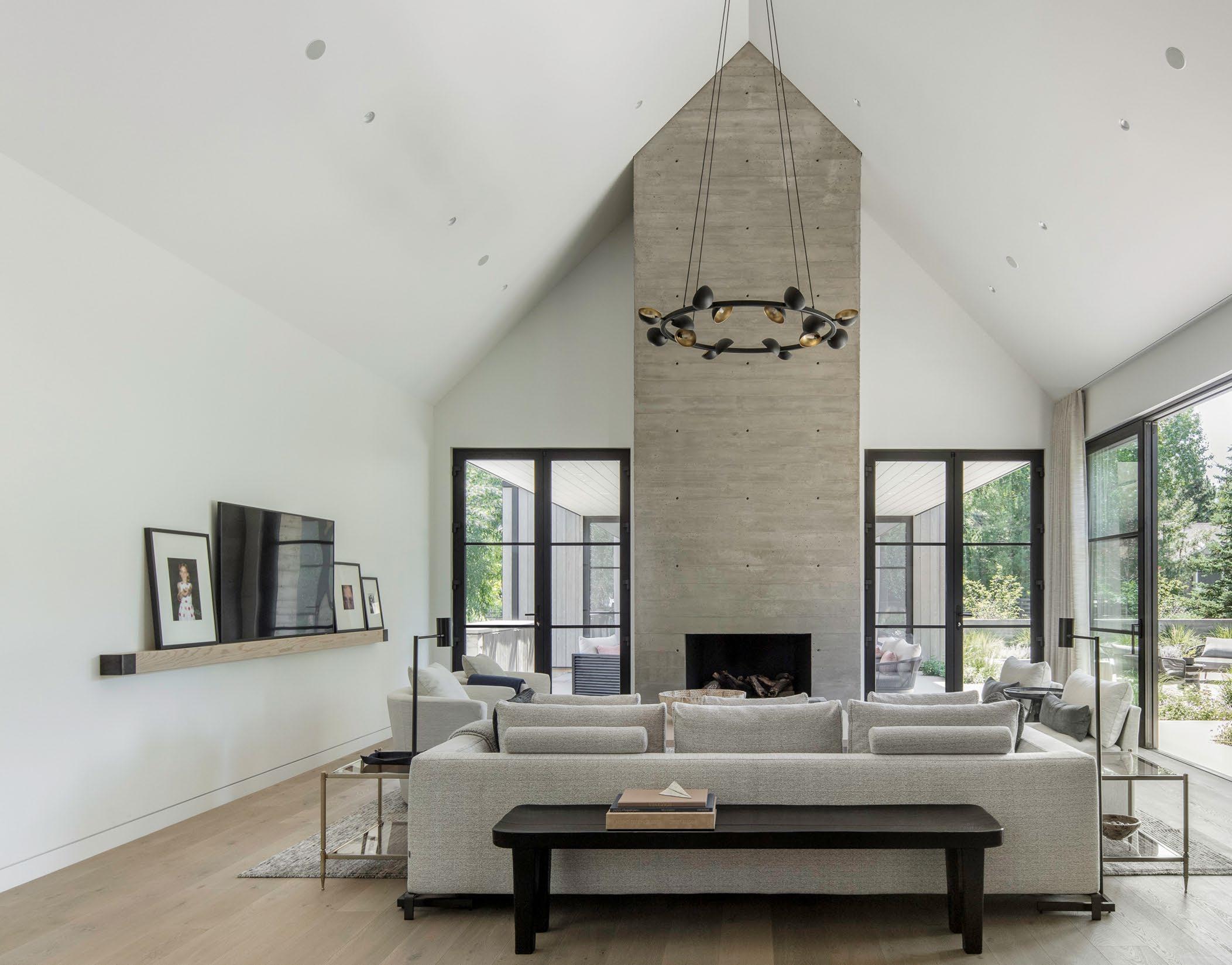This V-shaped architectural design comprises two distinct structures housing separate owner and guest wings Its thoughtful layout extends towards the property's edges, shielding the residence from neighboring homes while framing captivating views of a spacious central courtyard. A subtle front facade conceals the garage doors and welcomes guests with a sheltered entryway Upon crossing the threshold, a grand communal space serves as the focal point, offering seamless vistas throughout the home, connecting the interior with the serene private courtyard and lush gardens At each end of the structures, the arrangement of the master suite and guest master suite is adaptable, ensuring residents can tailor their spaces to embrace their preferred views Inside, the interior volumes mirror the soaring gabled rooflines, creating generous ceiling heights and expansive, open vaulted spaces that contribute to a sense of grandeur and airiness.
