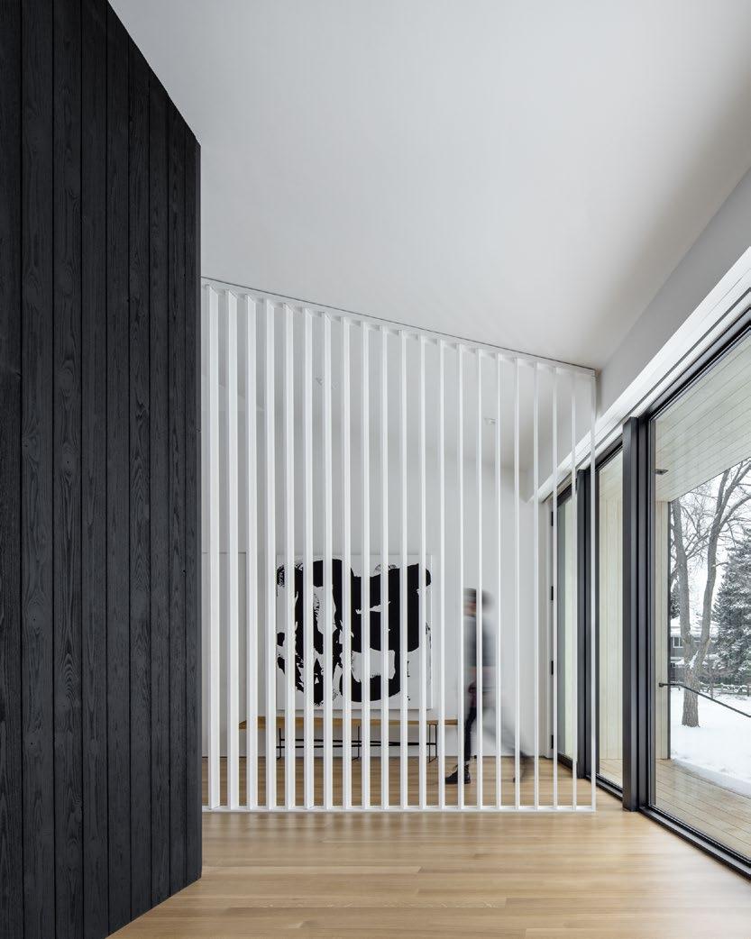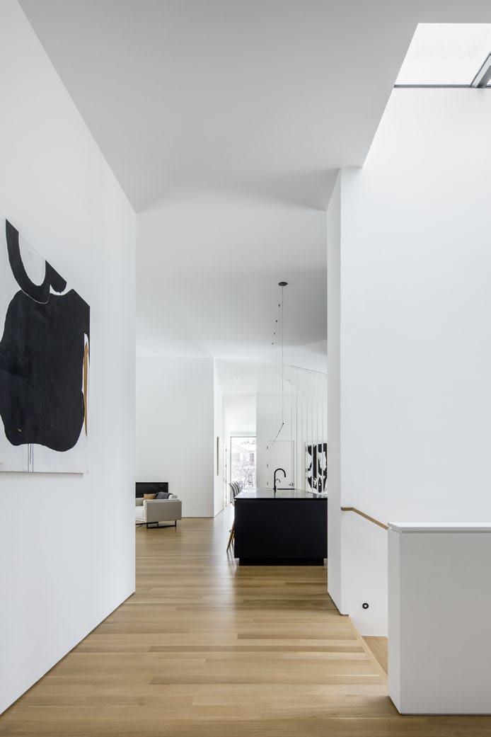 The interior pallet of white walls and white oak floors shine through, yielding clean, modern spaces that remain bright and inviting. The kitchen, unlike the rest of the home, is a dark central core reflecting the blackened exterior, drawing attention to itself as the focal point and heart of this modern home. The rest of the house pinwheels around as a continuation of solids and voids. Public spaces weave throughout and remain open and inviting, while the ‘solid’ spaces, the private rooms, are intimate and comforting