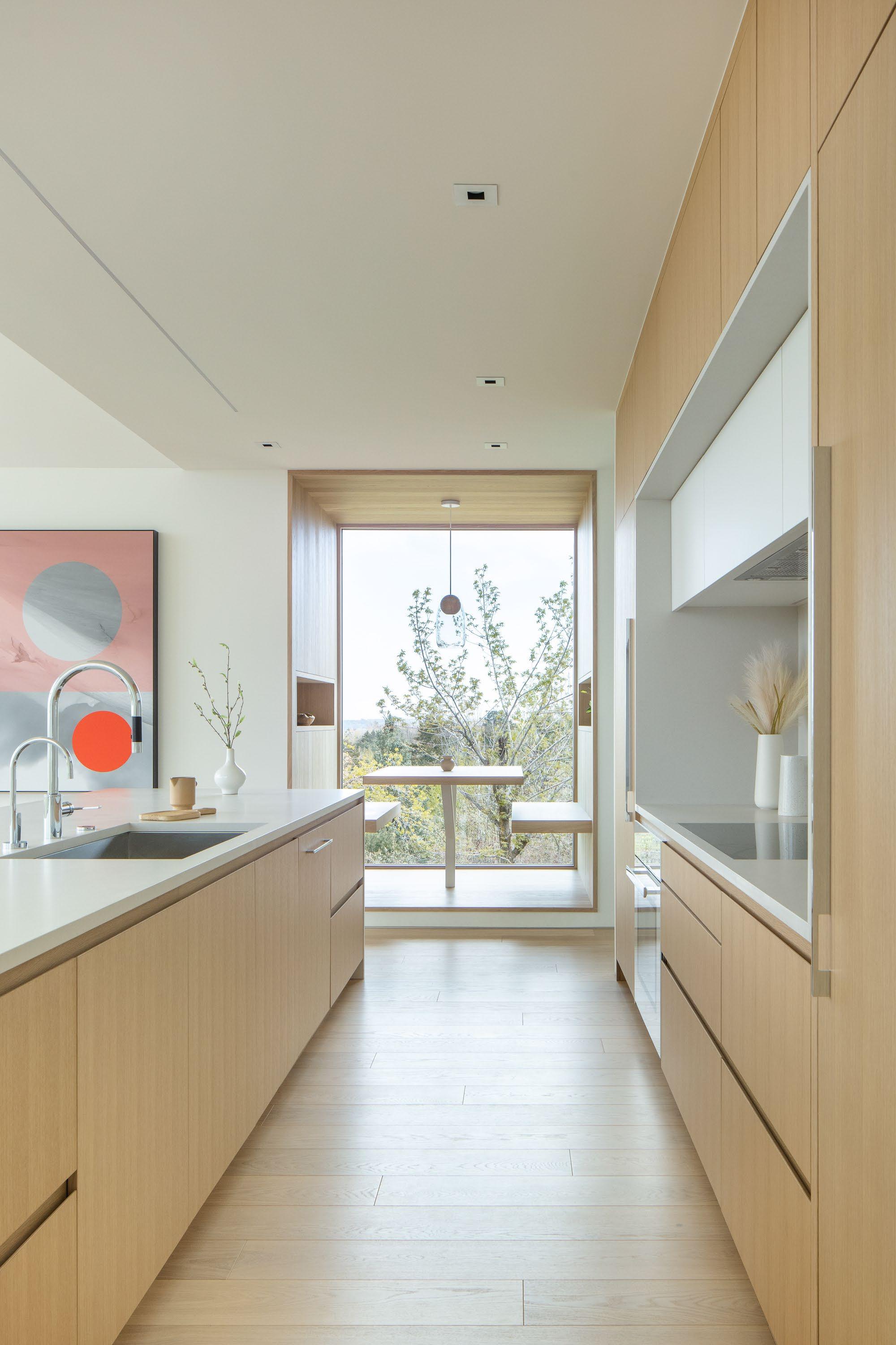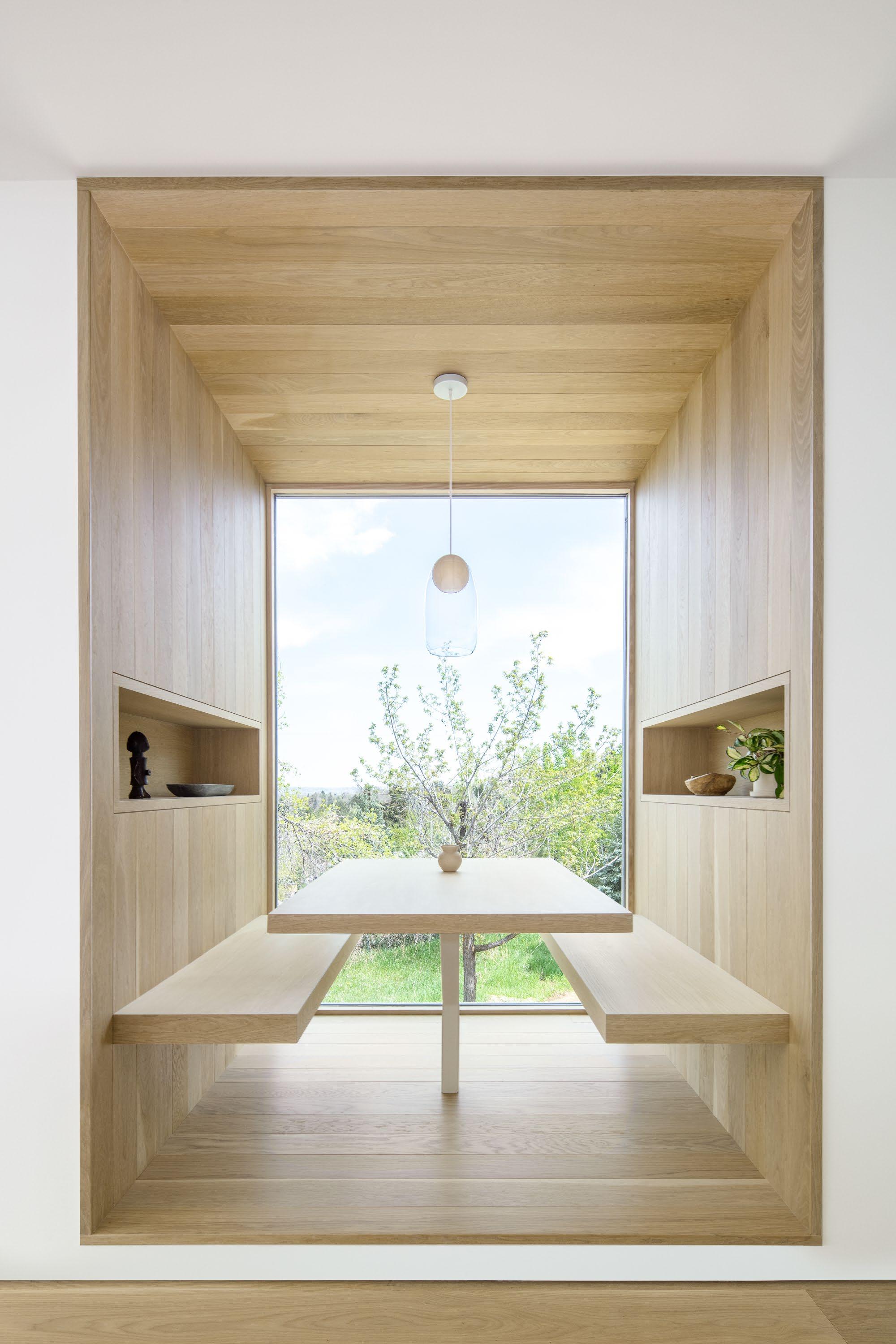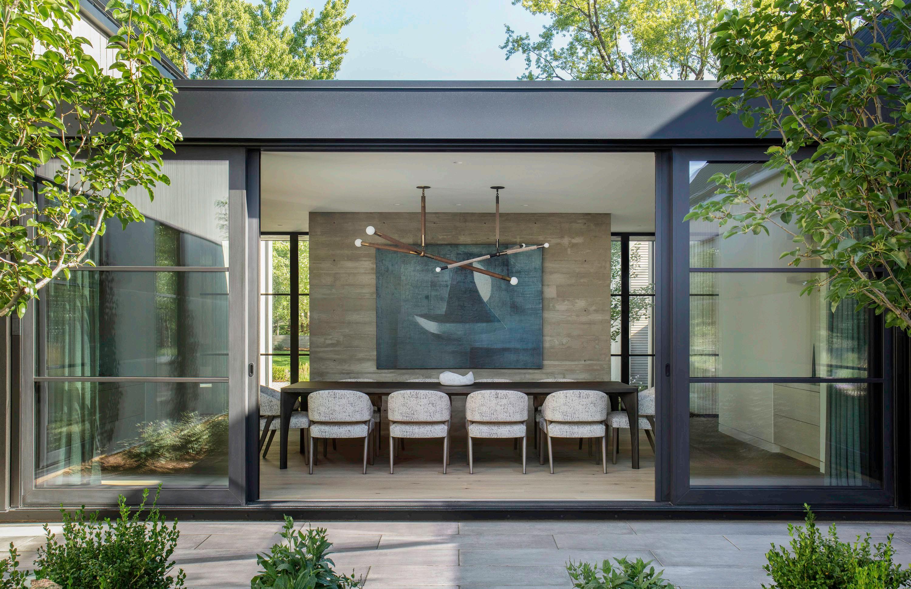 The owner’s passion for Asian art is impeccably integrated with the interior design The deliberative color palette, choices in finishings, textures applied for backdrops (the Shou Sugi Ban wood finish behind the dining room table, for example), down to the style of window frames demonstrates how Studio B keeps a keen eye on everything in view