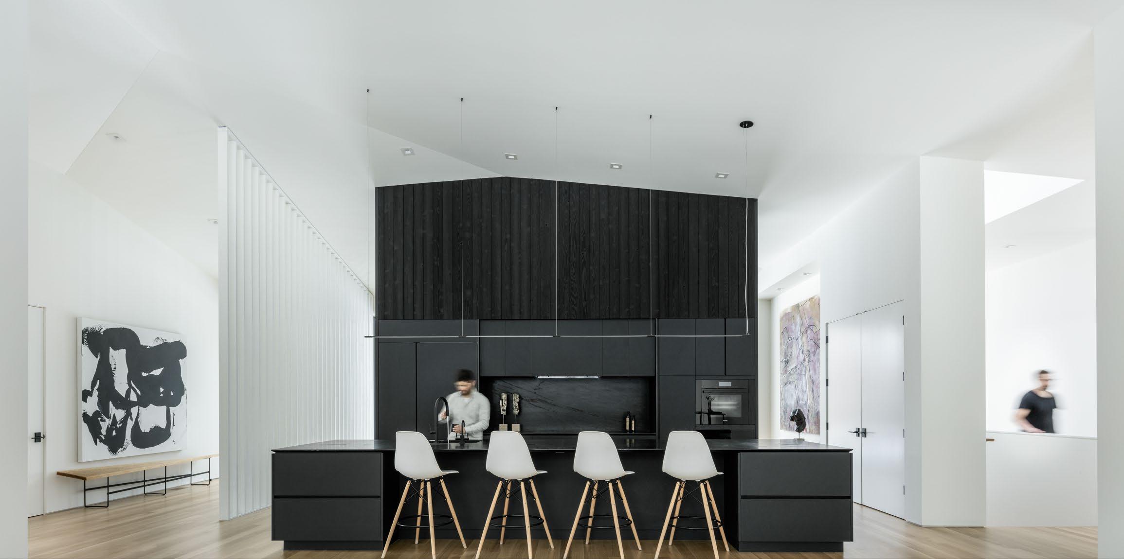 The ceiling above follows the rooflines, creating unique geometric configurations in each area, lower over intimate spaces, taller over common spaces What’s left is a black silhouette exterior quietly containing a complex composition of form and light, made to balance function and creative expression.