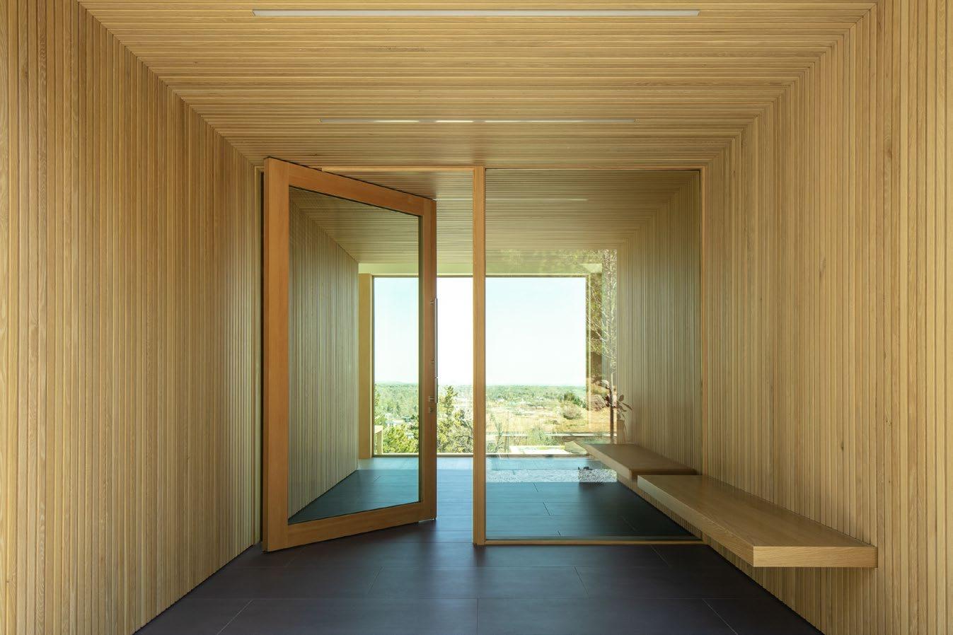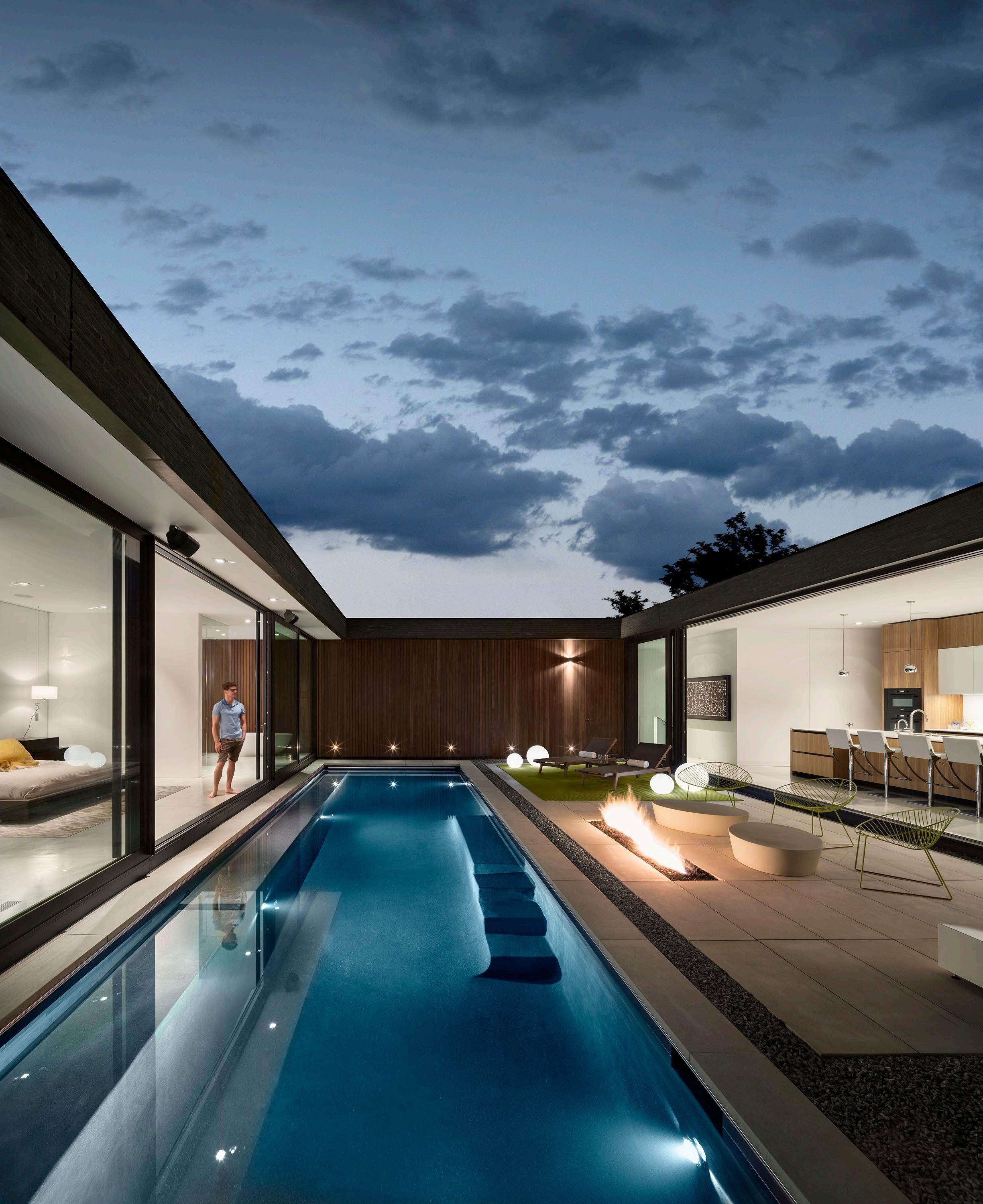 It has a simple and refined palette of highquality materials consisting of handmade brick, walnut, plaster, and glass. In its urban setting with no large dominant views to the exterior, the house turns inwards toward the interior courtyard & pool with a connection to nature by focusing upwards on the sky This concept is inspired by modern artists’ exploration into the connection of the sky, earth, and proportion