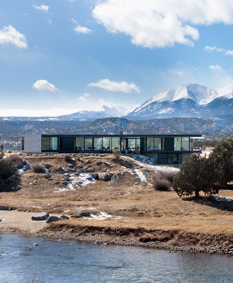 At Rivers Edge outdoor areas provide shelter for year-round use that are protected from the sun, rain and powerful winds coming down from the high mountain peaks. To withstand the harsh mountain environment, durable, maintenance free materials were utilized Inspired by the wavy, deposited sands along the river bank the raked stucco provided an organic, textured, and durable surface. Ubiquitous in the surrounding agricultural areas, weather steel panels clad the utility areas of the house. The weathered steel, warm toned stucco, concrete blend with the natural environment.