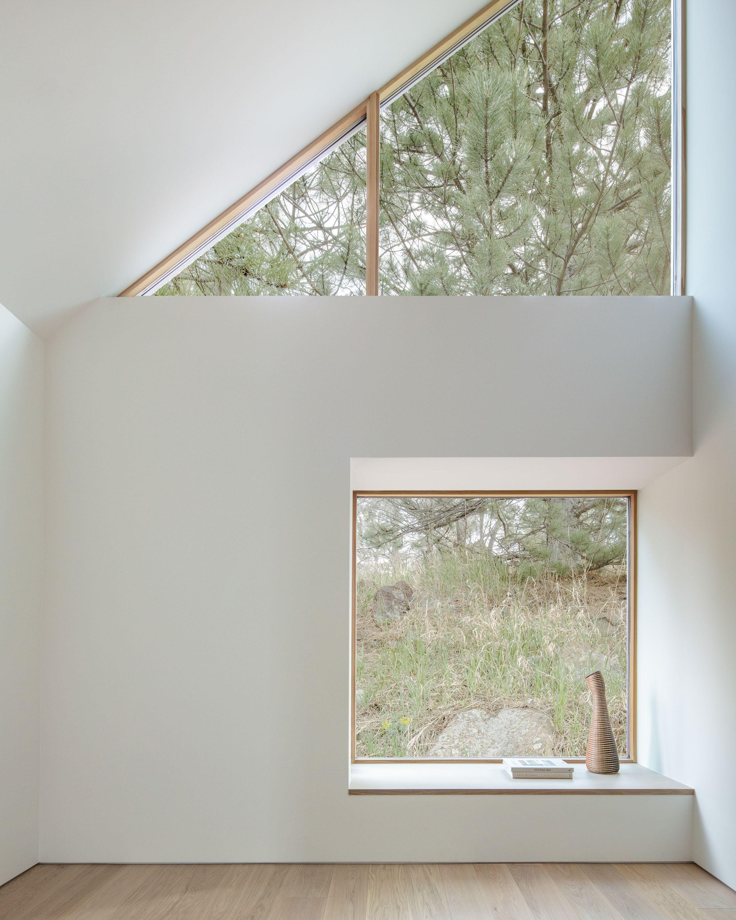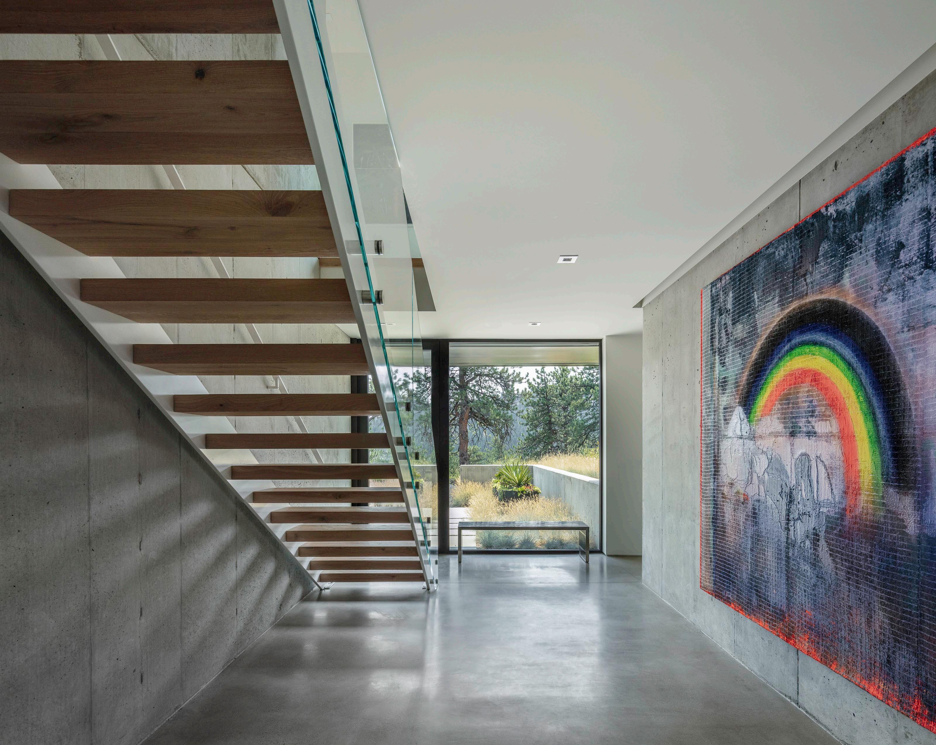 The program is divided between an upper private level, public main floor and lower guest level with the windows and doors carefully placed to ensure privacy, capture views and avoid direct sun because of the art