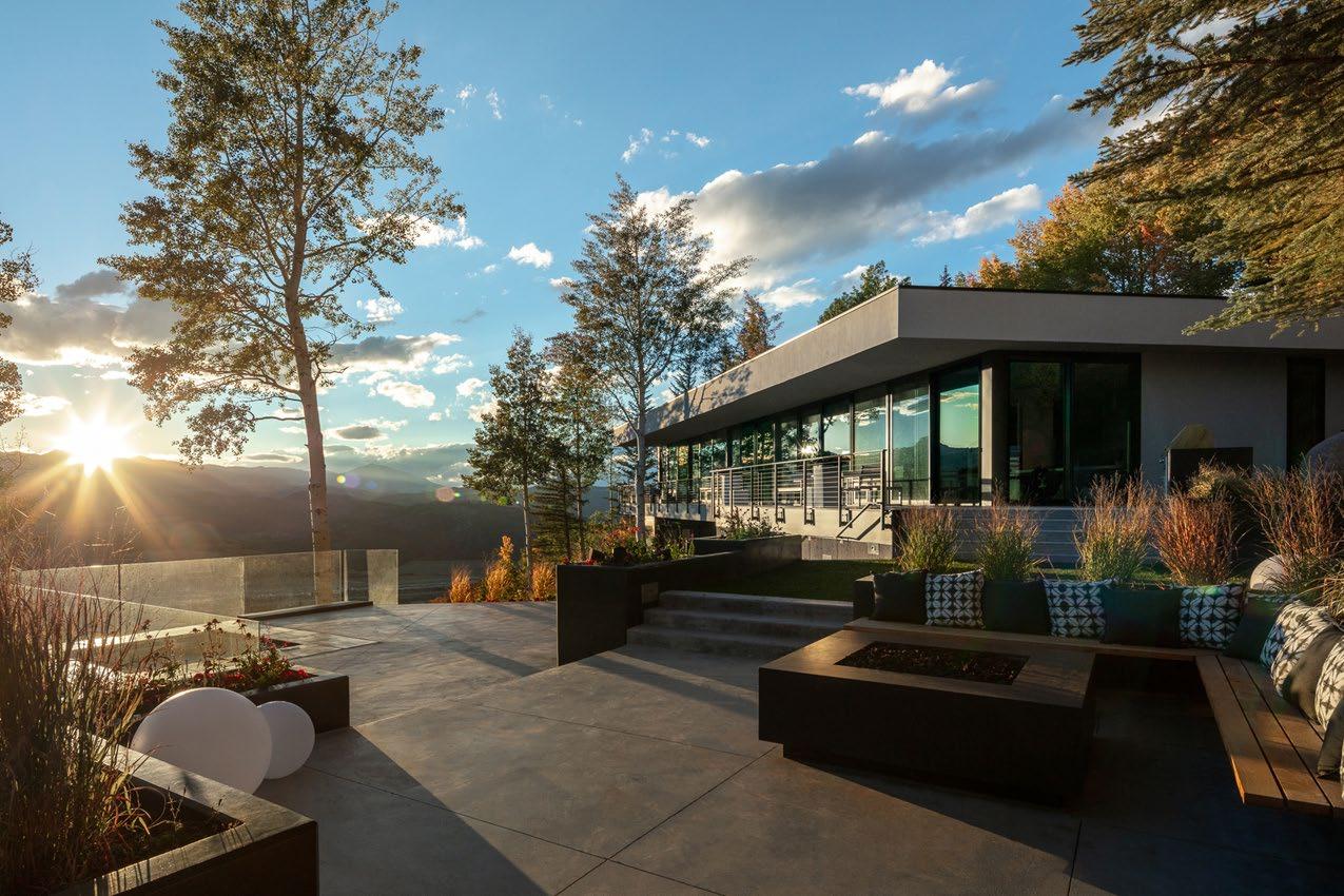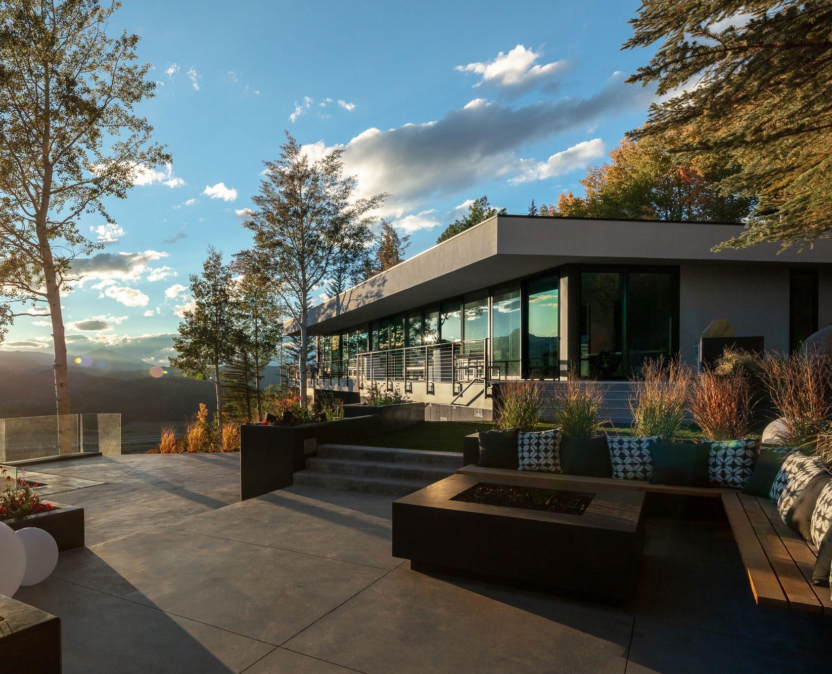 Arrival at the residence is from the uphill side of the structure. It is an intimate and quiet outdoor space tucked amongst a grove of aspen trees. Then the view rushes to greet you upon entry through the front door, as the space unfolds across the upper-level living zones (kitchen, living and dining area, master bedroom and bath) with floor-to-ceiling windows and doors spanning the entire south side. The terraces extend the living areas further along the hillside, for outdoor dining and social gathering